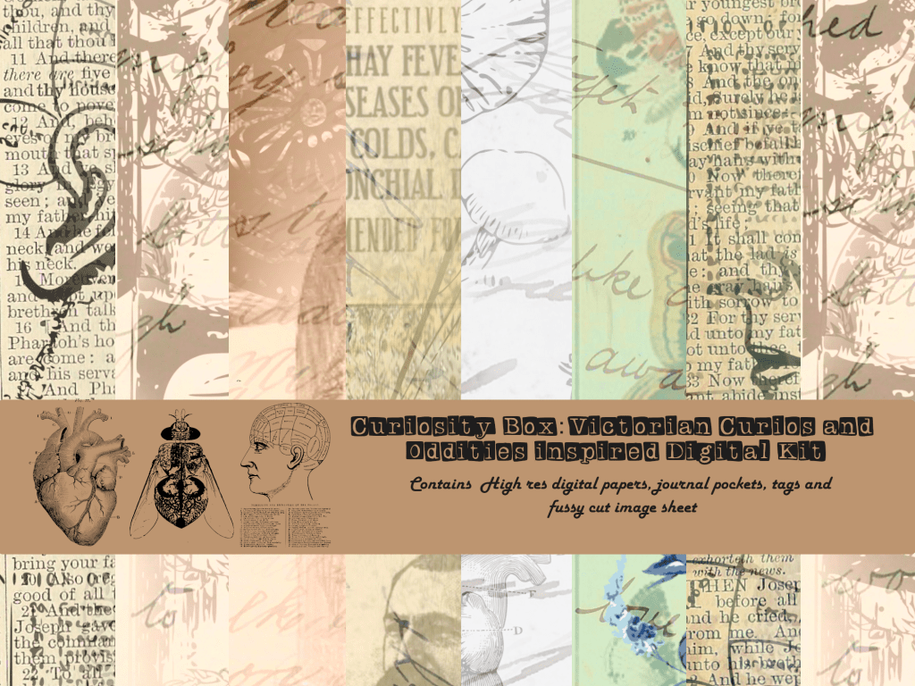 This kit contains high resolution digital papers, journal pockets, tags and fussy cut images all with a Victorian Curious theme to help you create your own book of curiosities, whether it be an altered book or a junk journal!