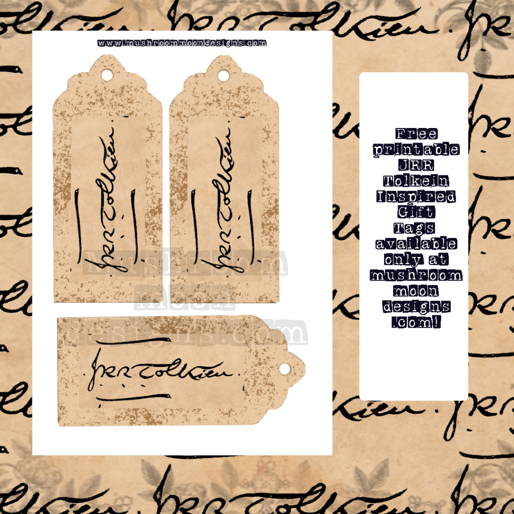 And here is this weeks FREEBIE! Yes, every week over here on mushroom moon designs I create and give away a free download for junk journaling or paper crafting! This weeks Freebie is a selection of 3 J. R. Tolkien tags for you to print off, cut out and use in your journals, paper crafts or even for gift wrapping!