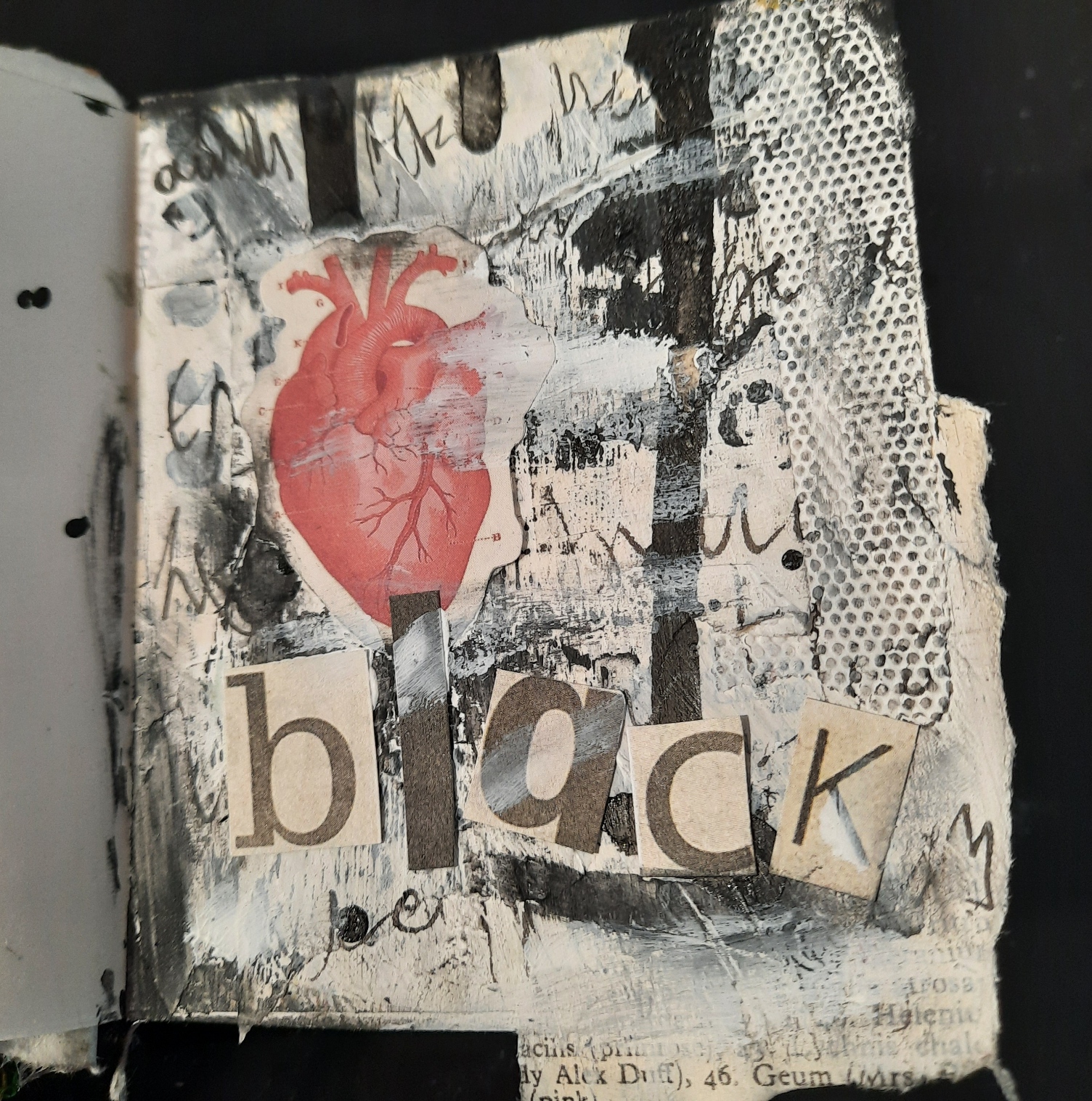 In today’s journal entry I have gone for the theme “black”. I didn’t want to just use black paint or make an all black picture though, so the idea to use a heart came to mind as in a “black heart”. I used lots of texture in the background of this entry from different papers and packaging. I used a lot of white gesso, black acrylic paint and black acrylic ink in my image and finished it off with serial killer style letters cut out from various packaging and old magazines.