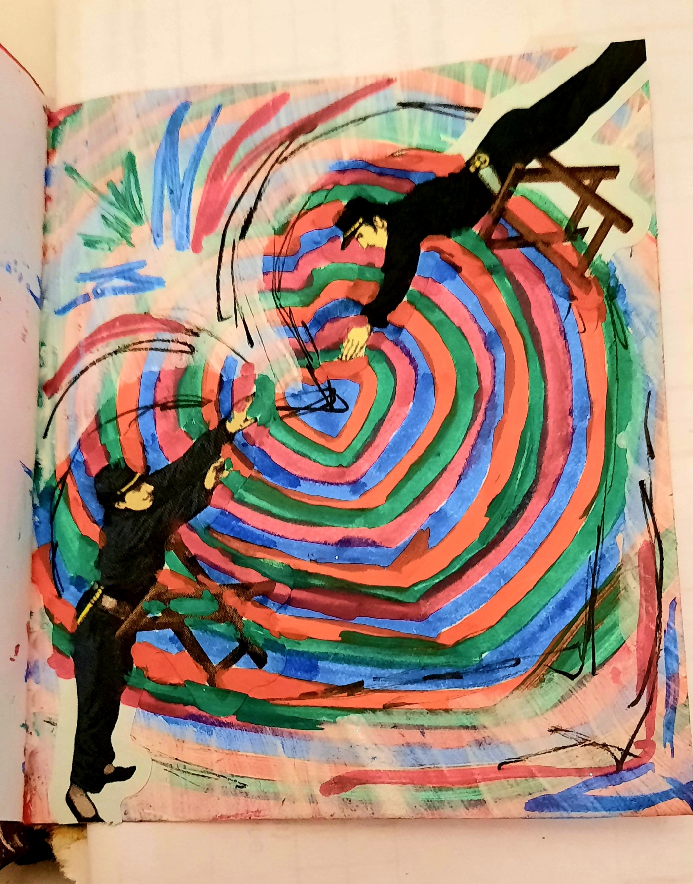 In today’s journal entry I created the background using acrylic paint pens. I masked over the image using acrylic gesso and then used some fun stickers of these acrobatic vintage style men reaching over the heart shaped void to each other. I then just added some marks using pens.