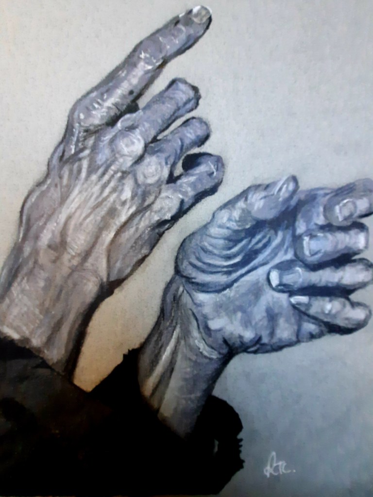 The first picture I have entered is a pencil crayon drawing I did on pastel paper back in 2020. It is a study of an elderly person’s hands. This was quite a challenge for me as I was not used to drawing with pencil crayons or drawing hands and I was really proud of the result. The following two paintings are pieces I have done specifically for the exhibition.