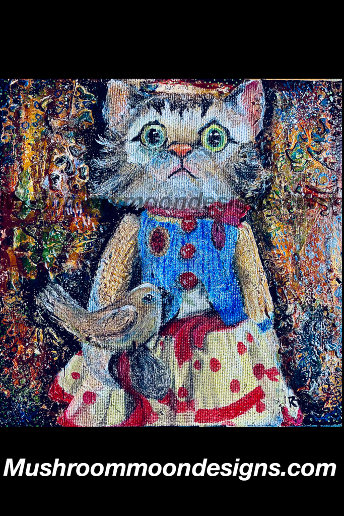 The cat pictured is based on one of the art dolls made by the very talented artist Annie Montgomerie. I love her sad and surreal animal characters and fell in love with this little kitten. I was particularly drawn to the wide eyes and the shiny red button on her waistcoat. You can find out more about Annie Montgomerie’s work at her website here.