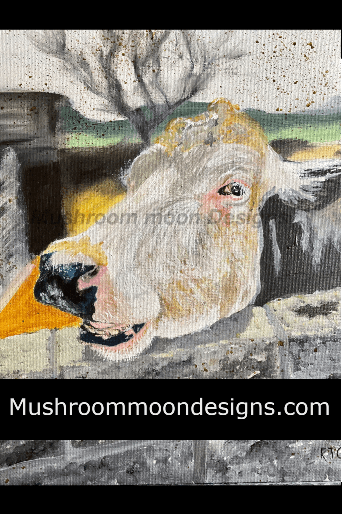 The first one is acrylic paint and acrylic ink on canvas board. It’s based on a photograph I took- see below, of a very friendly cow on one of our Blackburn Artists society trips to Lower Slade Farm in Padiham, Lancashire.