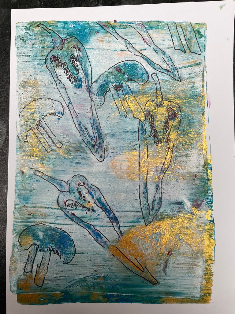 I created these papers using my own artwork. I started the process by creating some prints using a Gel plate mono-printing process. I used acrylic paints, real-life chillies, and mushrooms to feature in the designs. I then drew into these designs with pen and ink.
