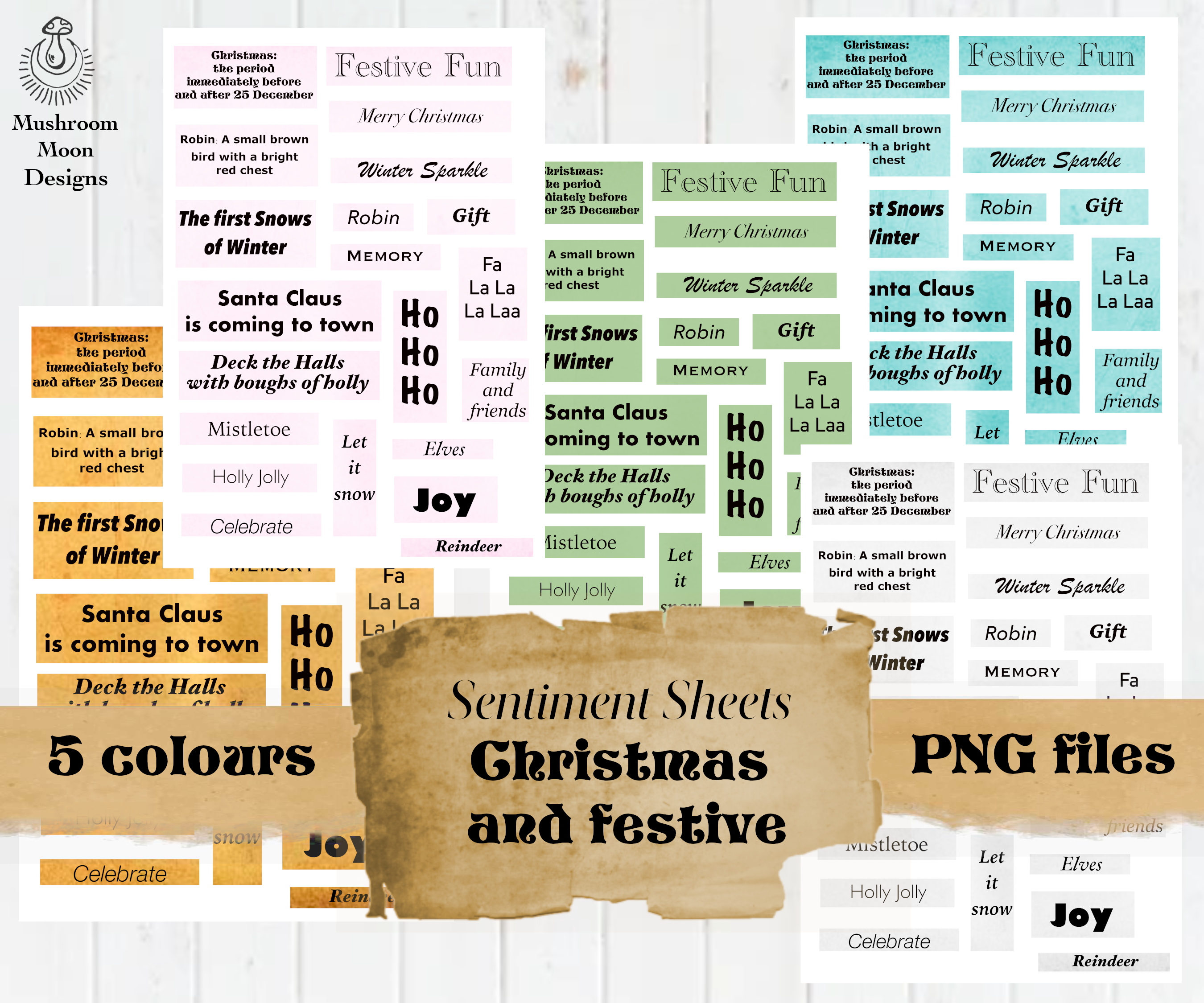 You can also find handy Christmas sentiment sheets on my Etsy shop. These word sheets contain Festive and Christmas phrases to adorn cards, tags, collage… your imagination is the limit. The kit includes sentiments in several colour ways so you can use them in a multitude of projects! A tip If you would like them smaller is to just print them two documents to a page, that way you get twice as many sentiments but in a smaller size- useful for smaller, more intricate projects.