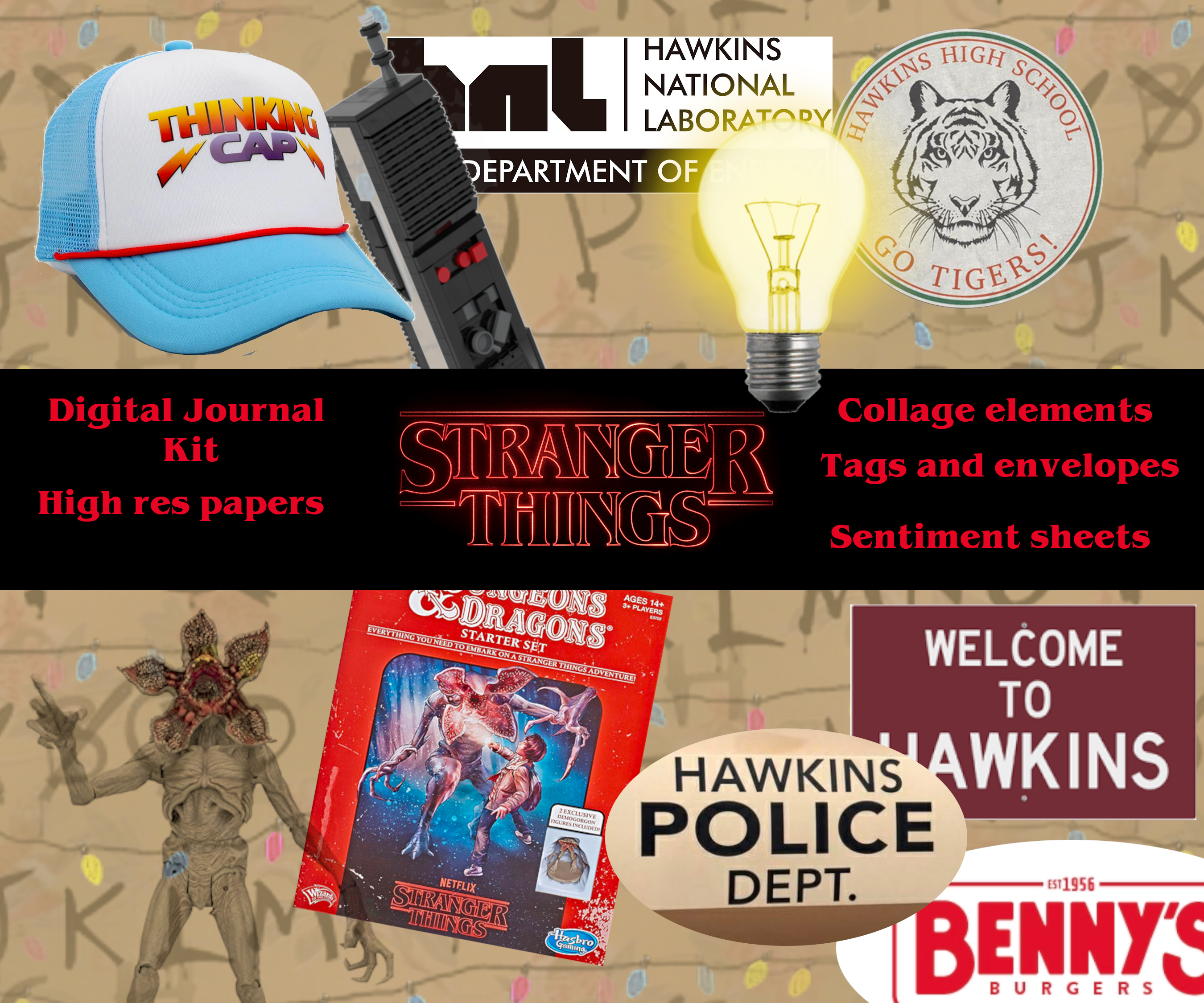 Along with the 1980s and Stranger Things themed background papers this kit includes fussy cuts, junk journal pockets and tags so you can create your very own journal and fill it with Stranger Things fan fiction!