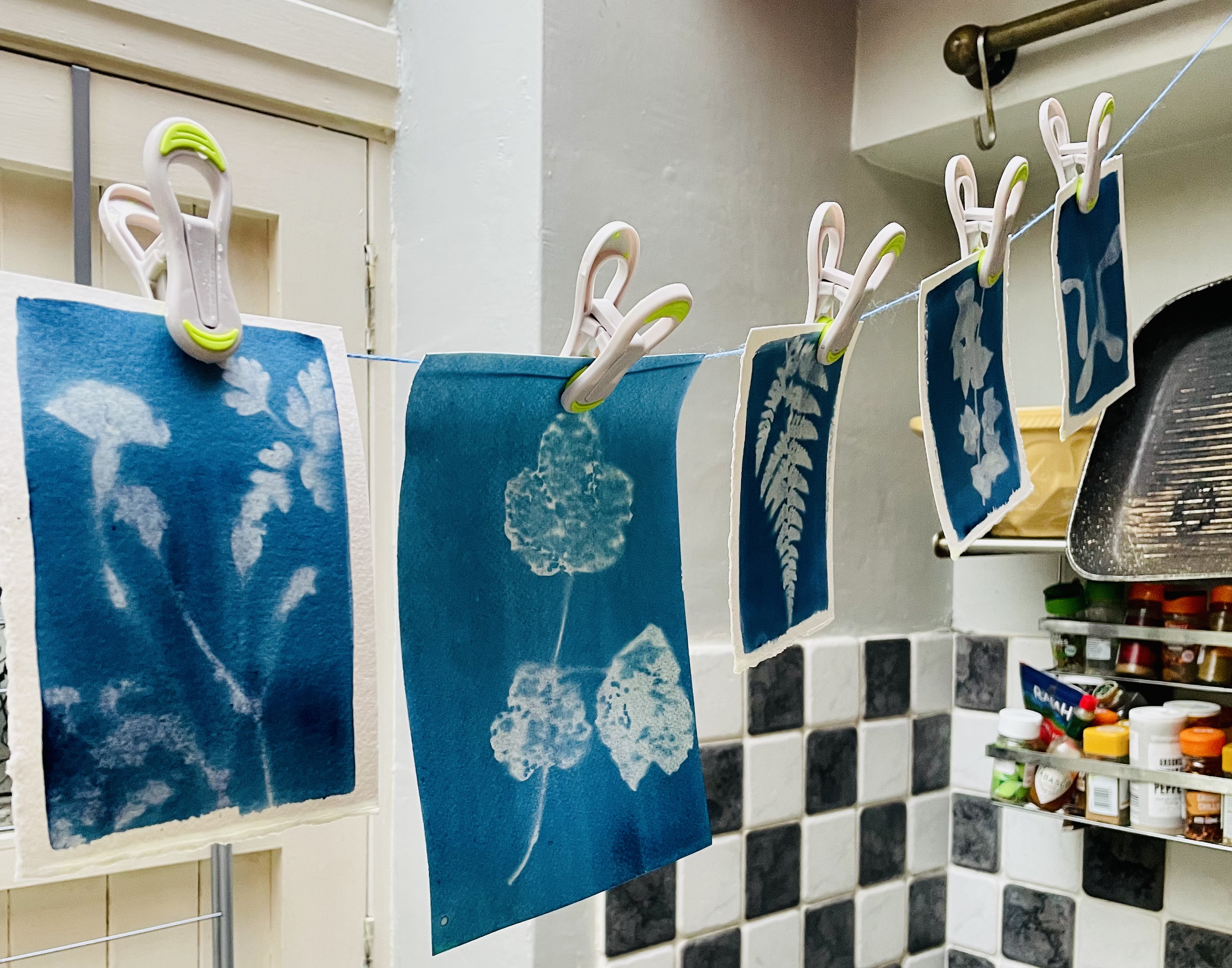 The white areas are where the chemical has been blocked from the sun in this case using plants and natural items, and the dark blue is the negative space which has reacted to the ultraviolet light. I have found this a great way to create art works but also to connect with and become more present with the nature in my local area.