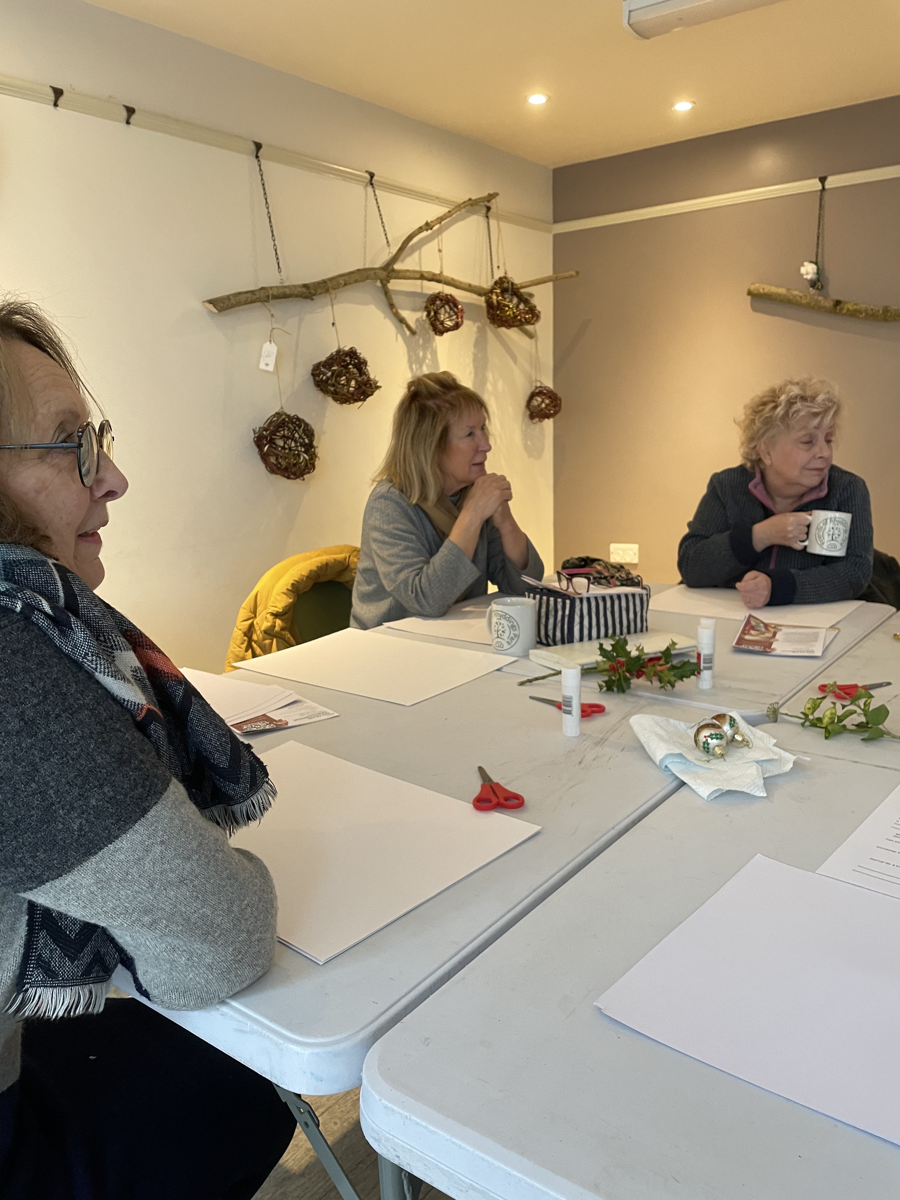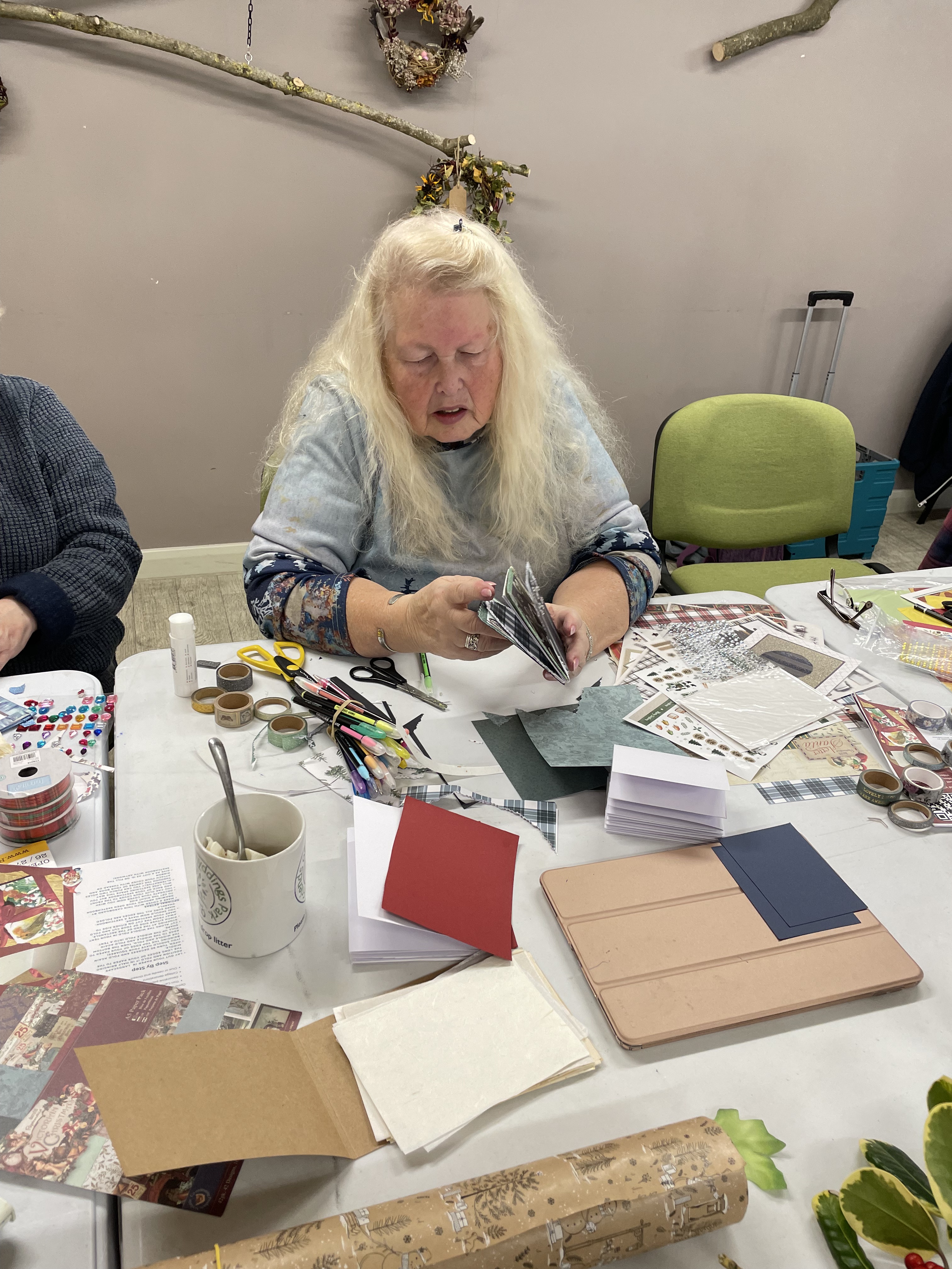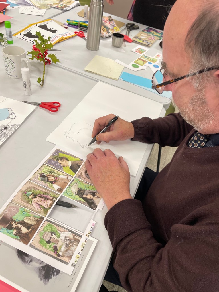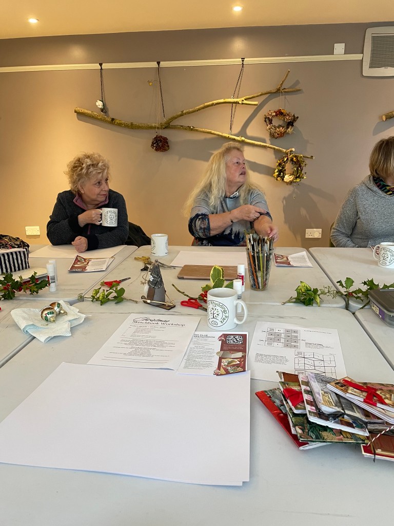 In today’s workshop, I showed the Blackburn Artists how to make three different sketchbooks using only one sheet of paper in each. We made the pages of the books using different paper folding techniques and then spent many happy hours decorating our sketchbooks with Christmas-themed designs and artwork. If you would like to try out making your own sketchbook, why not check out these videos I made explaining the process!