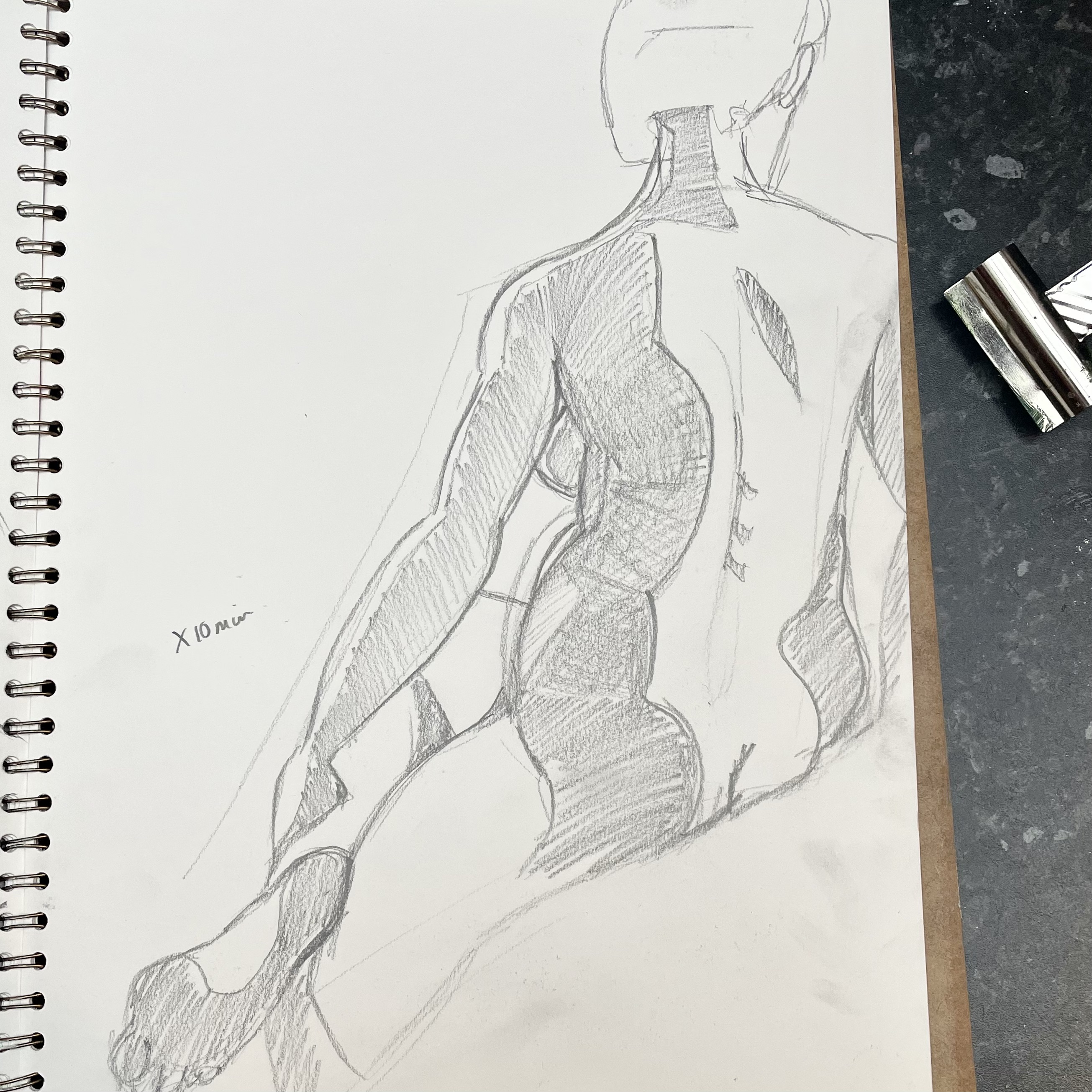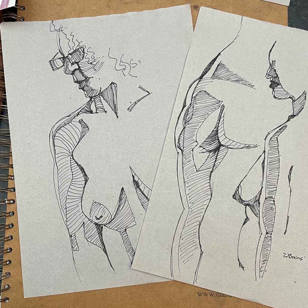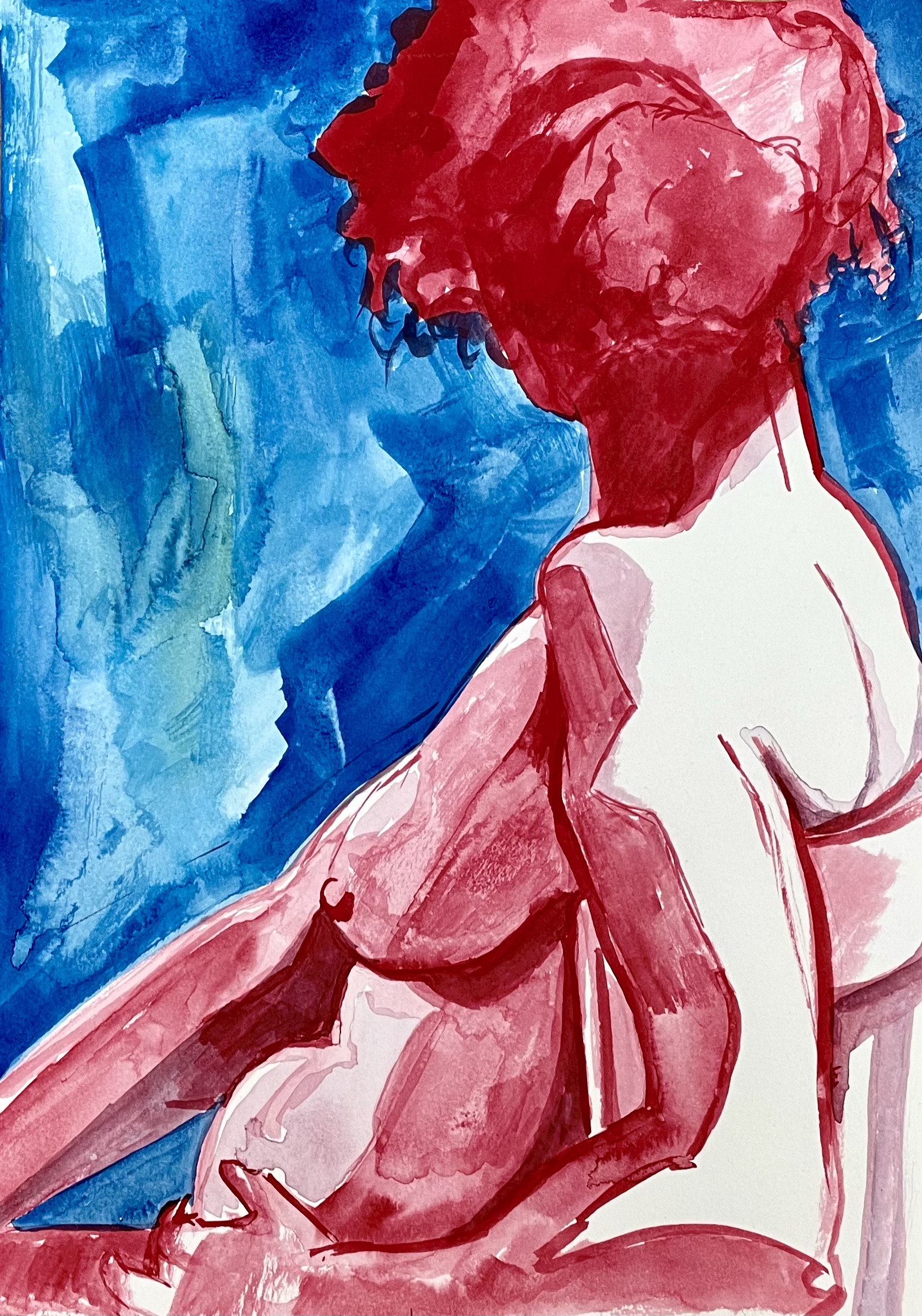 The picture above is a painting/drawing I completed in blue and red acrylic inks, this was a 30-minute pose. Here are a few of my sketches from that drawing session: