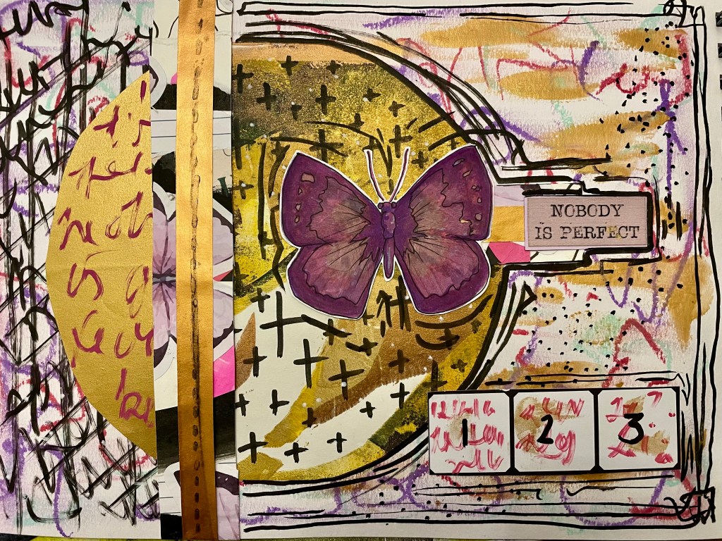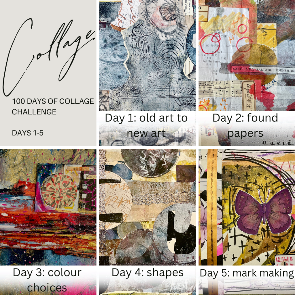On Day Five, I tried using mark-making tools. The challenge was to use at least two types of paper and two different mark-making tools. I used mixed media gel sticks and acrylic paint pens to create marks. I also used metallic craft paper, gel plate prints and scraps from old collages. For my mark making I am drawn to ascetic writing. This is script type shapes that are not actually a true written language. I also enjoy dots and crosses. What kind of mark making tools are you drawn to? Try using them in your next collage. It’s as simple as a biro or as complicated as a quill and ink!