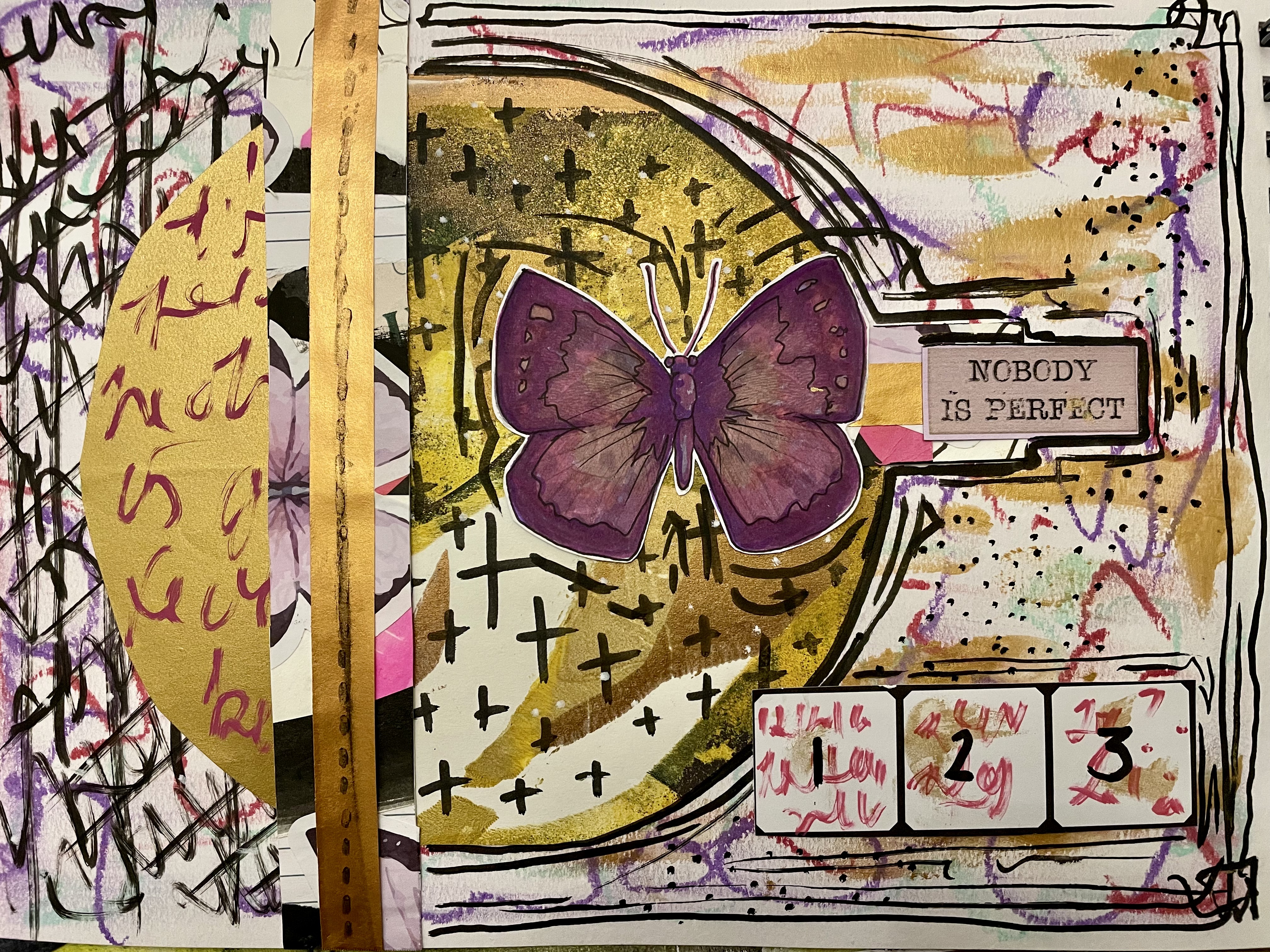 On day three I explored colour. I used papers in my artwork that had colours I was drawn to. This was a good way to explore what colours I like and what go well together. We looked at warm tones versus cool tones and whether we liked to mix tones in our work. As you can see, I like many bright colours! I like magenta and blue together and I also love metallic colours. What kind of colours are you drawn to? You could find you like bright colours and metallics like me. Or maybe you are more drawn to black and white or vintage sepia tones? There is no right or wrong answer, just experiment and go with your gut!