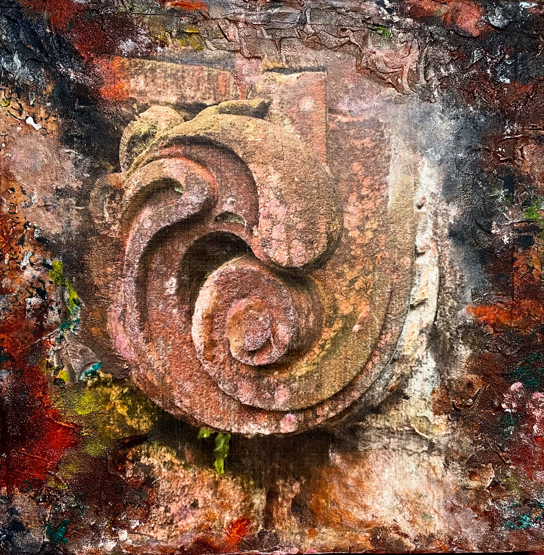 It started as a photograph I took of some stonework at a local Church. I wanted to recreate the textures of the stone wall covered in lichen on my canvas. I used some gel plate prints layered up to look like stone textures. I then added modelling paste and gel mediums on top to add texture. I blended it all with more acrylic paint and a sponge.