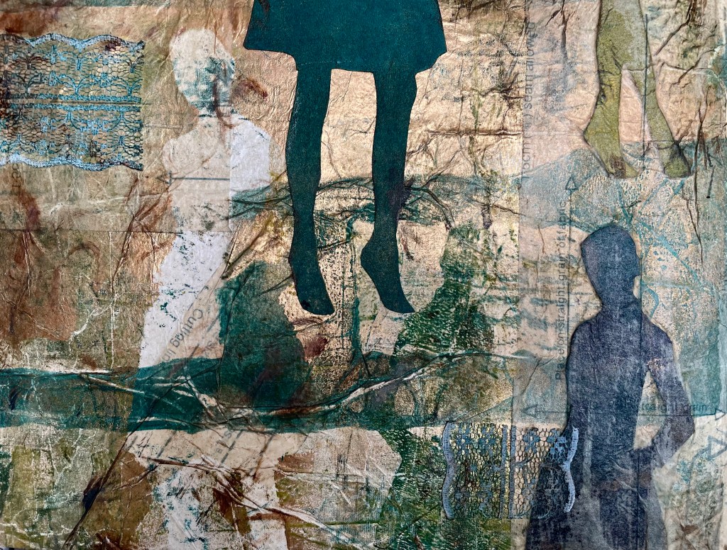 My gel plate prints, were printed on fabric pattern paper. It was great layering up the transparent papers. I also enjoyed seeing the pattern marks and lines come through the prints. I made some masks out of thin cards to create the “fashion models”. I used them in my prints and also ended up using the masks as collage fodder.