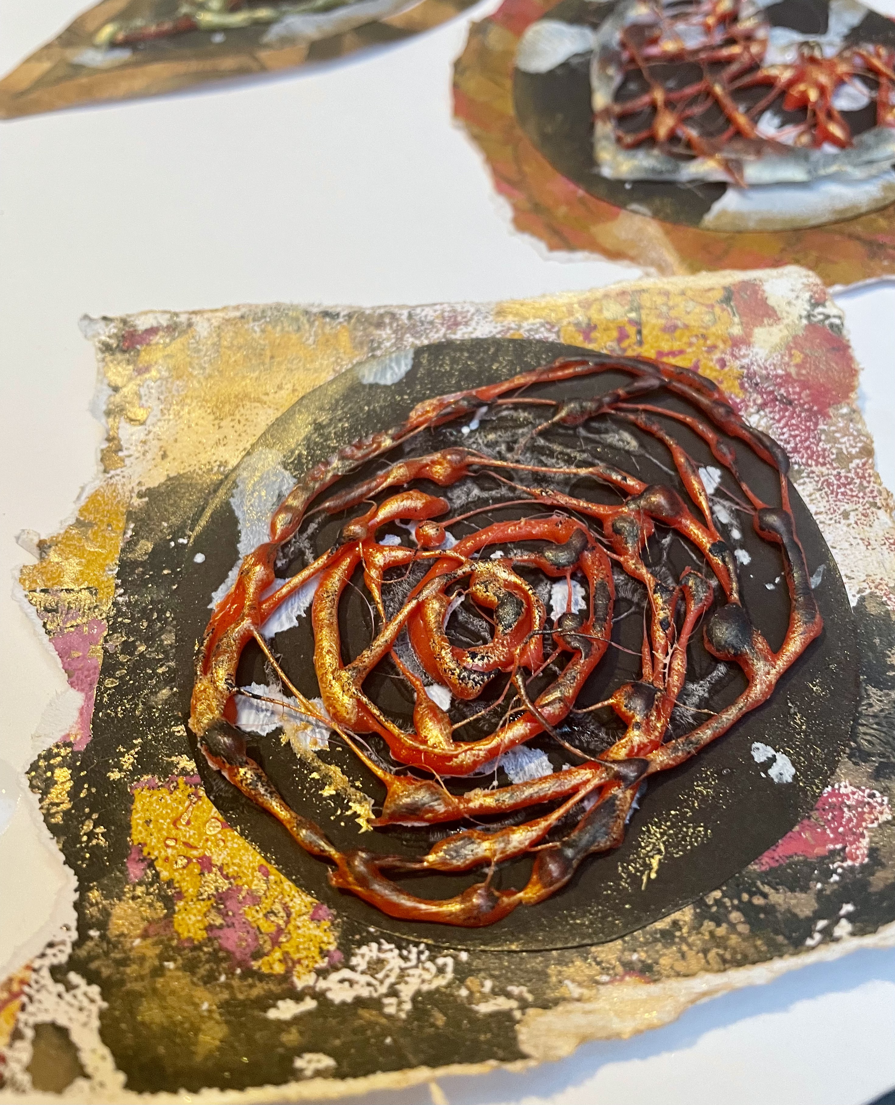 I had a go at making some focal point “roses” out of hot glue gun glue. I saved my acrylic skins for use in future projects.