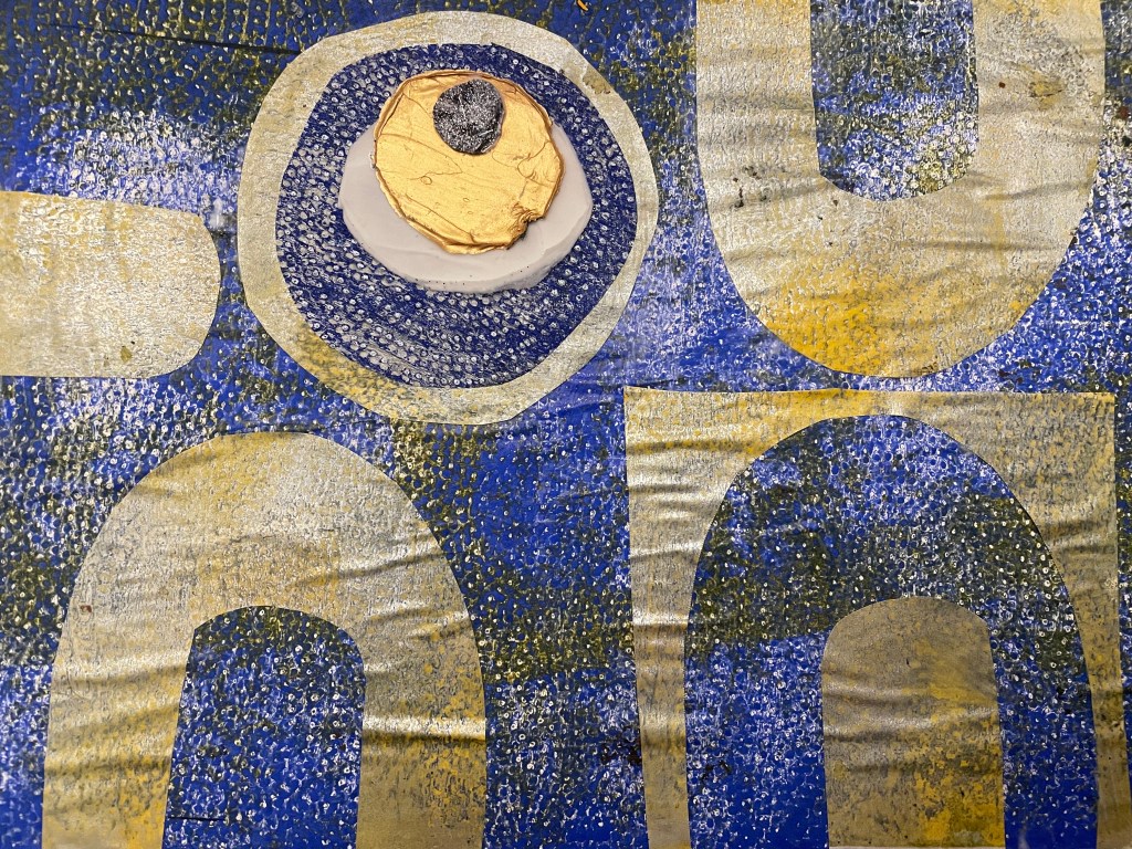 I was pleased with my gel plate prints using kitchen paper. I also added some acrylic skins that I made in the previous lesson to create the “eye” in my collage.