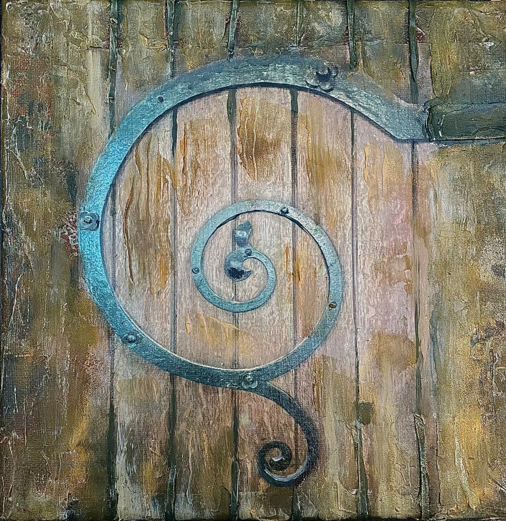 My favorite technique this week was creating a piece on a canvas as I did on day 23. So I chose a different photograph from the church and attempted to re-create this old wooden door. I used acrylic skins and texture pastes to create the textures in this collage. I was really pleased with the way it came out!