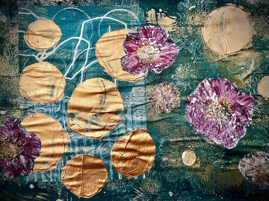 In day 32 we explored the magic of nature! We were encouraged to by craft a fantastical world inspired by the beauty of the natural realm. In this class, I had a go at printing on the gel plate with fresh flowers. This was a great way to get detailed textured images. I mixed my flower prints with some textured prints I’d made in earlier classes. This ended up creating a solar system of floating flowers.