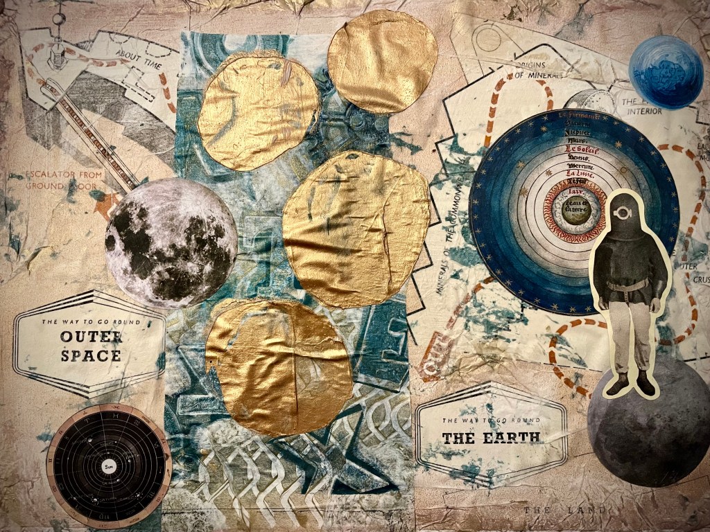 Our task for the last day of the week was to use any or all of this week’s prompts. I really enjoyed making a space-inspired collage but wanted to give it a more vintage style. I also liked how my textured papers looked in my floral fantasy collage. I also wanted to create more of a narrative. So I created this collage with elements of vintage papers, stickers, tissue paper and gel prints.