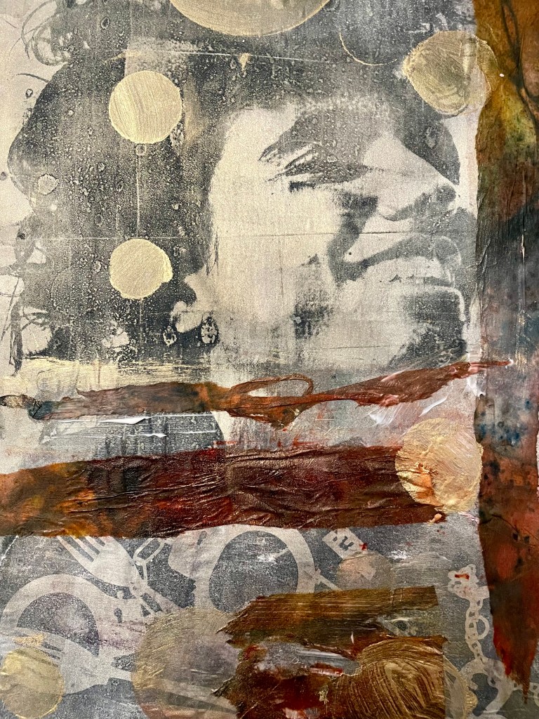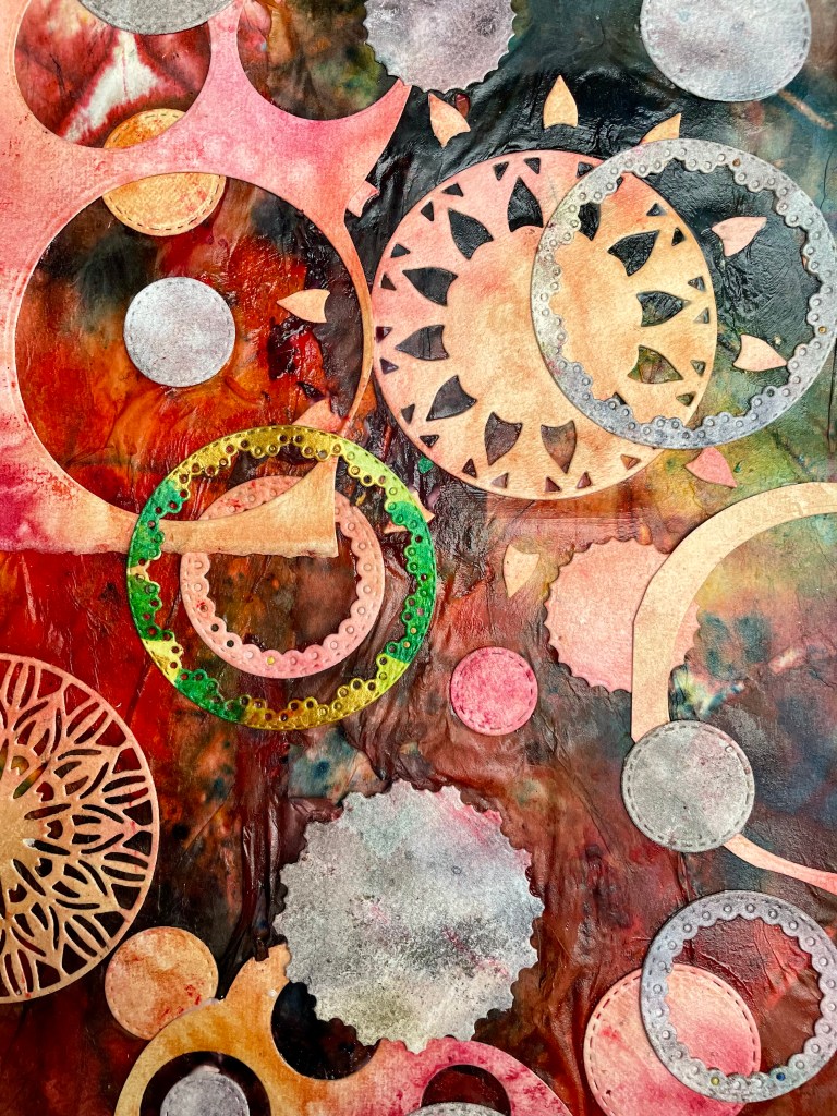 I enjoyed experimenting with this technique as I struggled to do it on earlier attempts. I had mixed results with my prints but eventually pulled one I was pleased with! I layered up my print with some scraps leftover from other projects and added some gold circles with a stencil.
