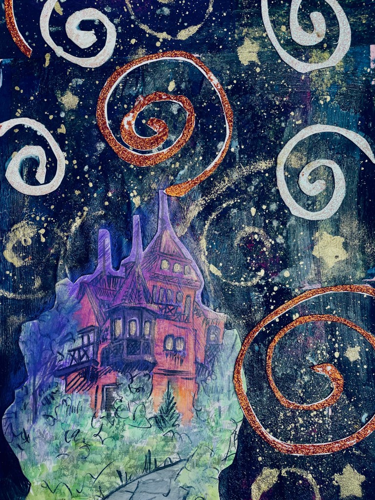 This is why I chose to add the glittery swirls in the sky. The house was a picture from a colouring book. I think it looks like it was sitting on the edge of a cliff surrounded by the night sky.