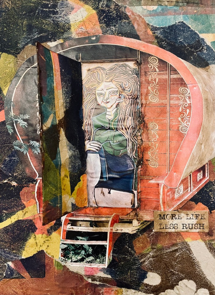 I found the caravan image in an old magazine and the woman is a Picasso painting from a book. I made the background in a past lesson on printing with nature.