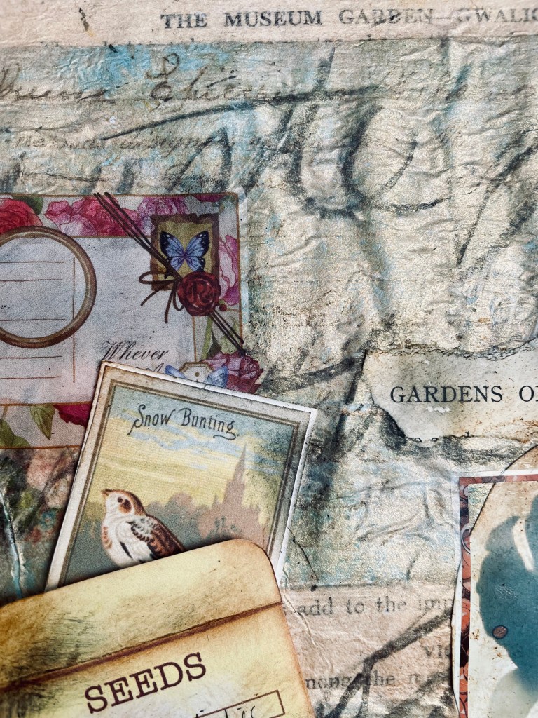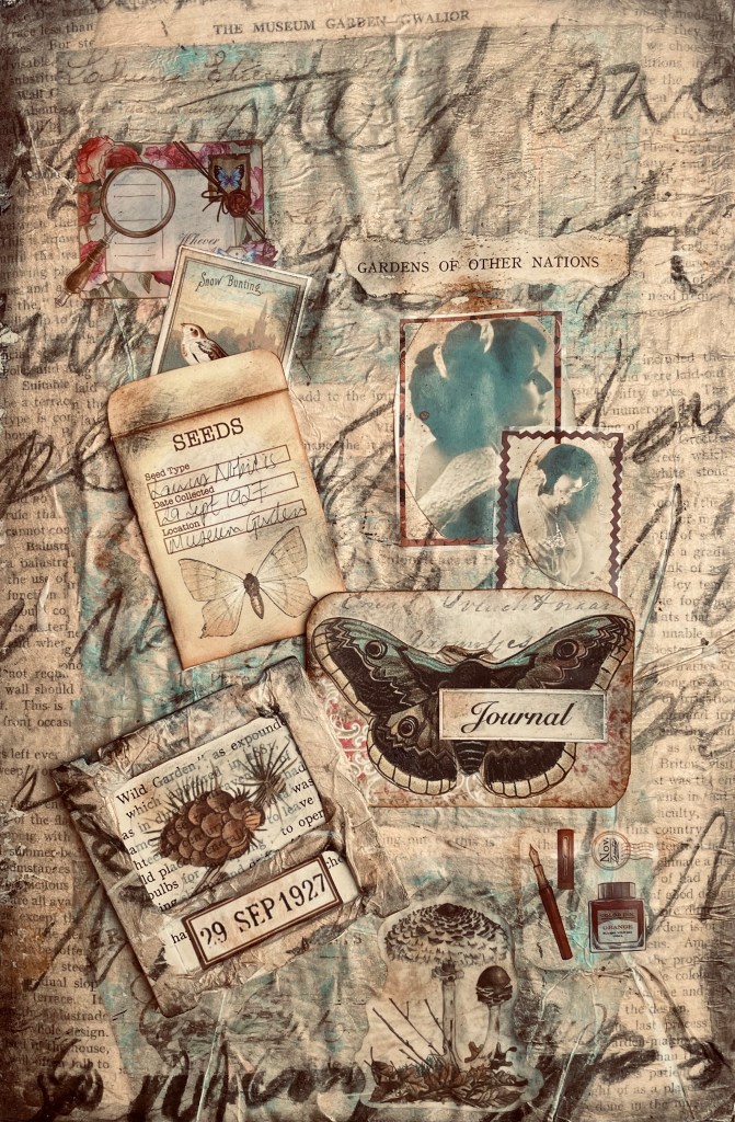 We began by choosing a theme or story. I chose the story of a Woman from the 1920s based on an Edith Holden-type character. This idea sprouted from some vintage photographs I found. I also found in my stash a faux seed packet. My character ventures out to different gardens around the world collecting and cataloging flora and fauna in her journal.