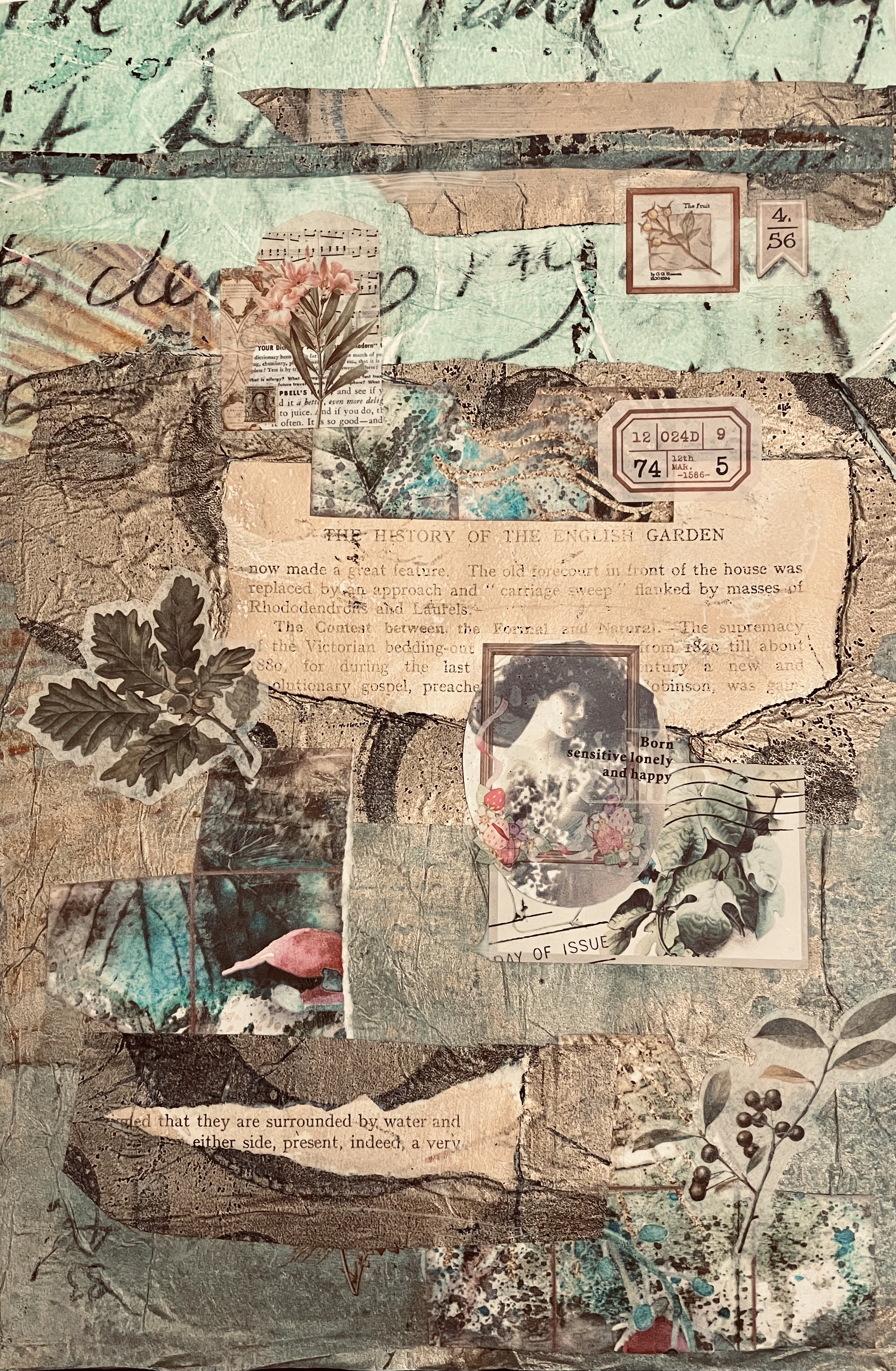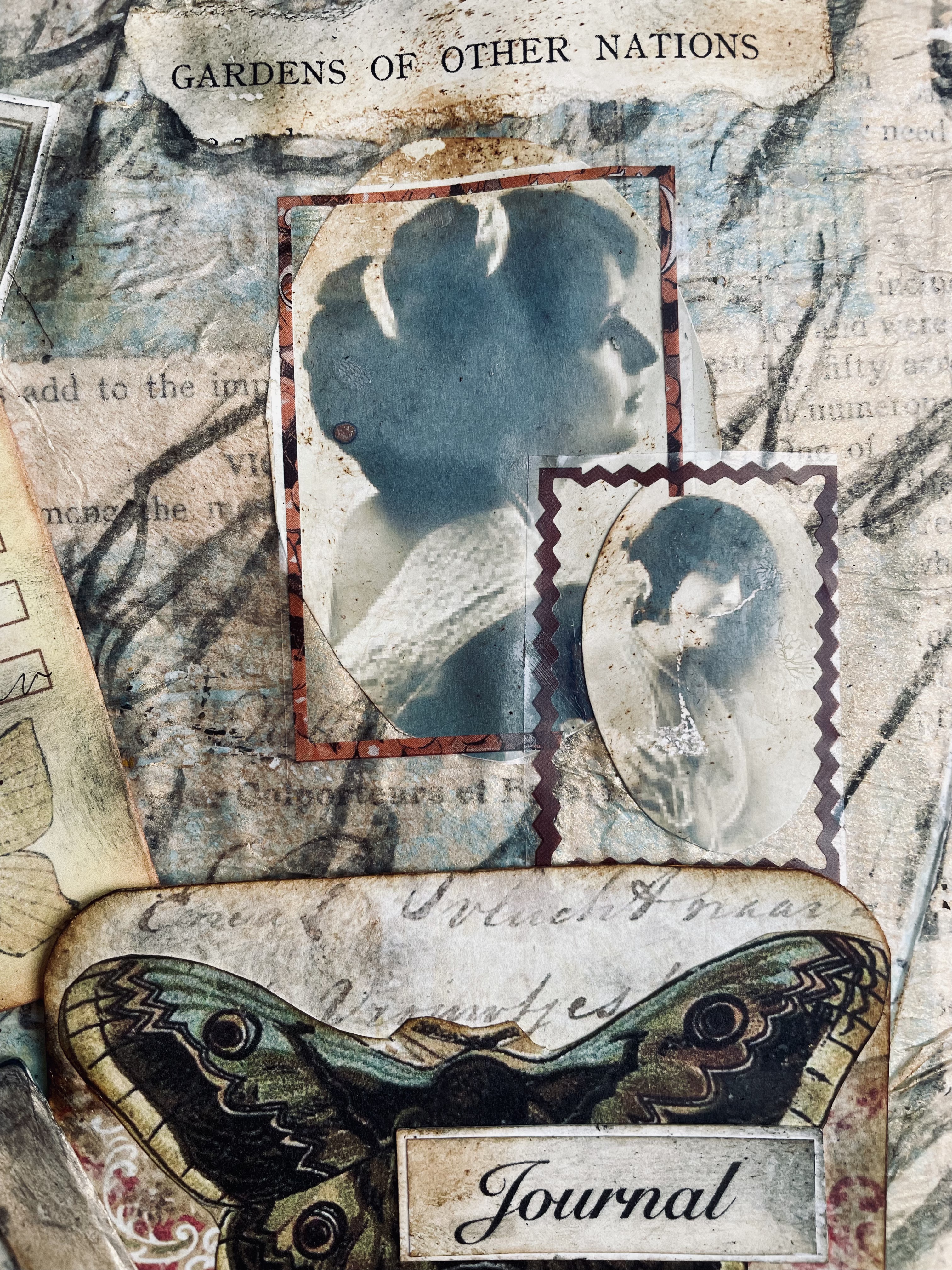 I used a combination of images, text, and textures to build layers that reveal different aspects of the narrative. I used book text, photographs, images and my own writing in gel plate papers to create my nostalgic collage.