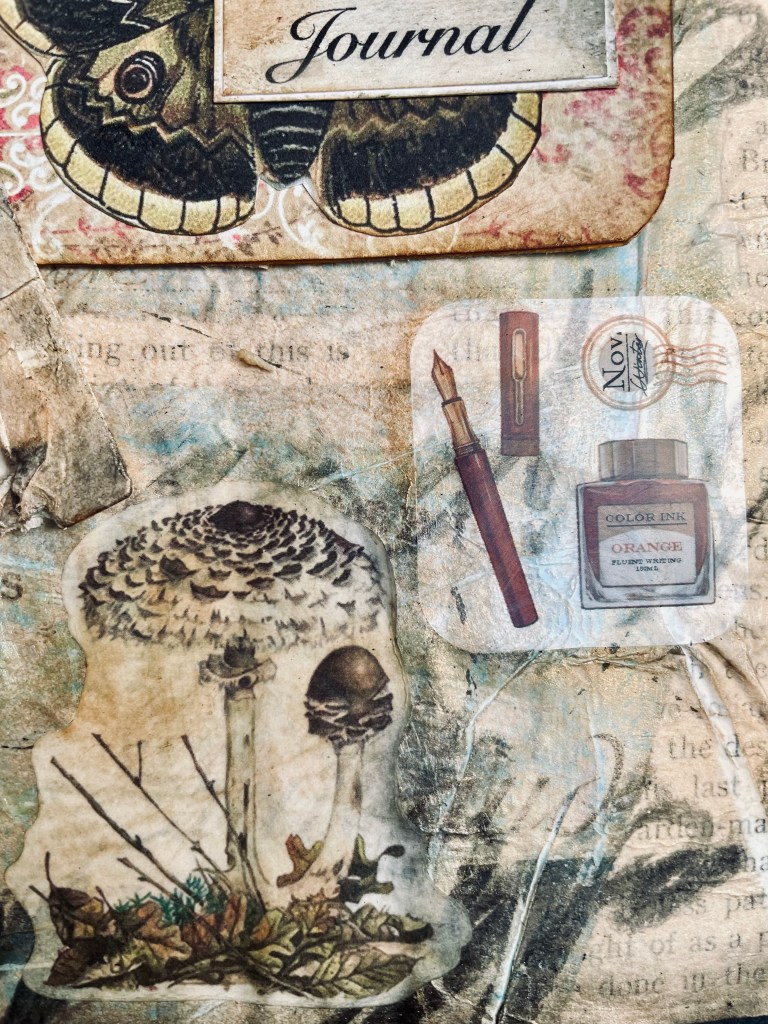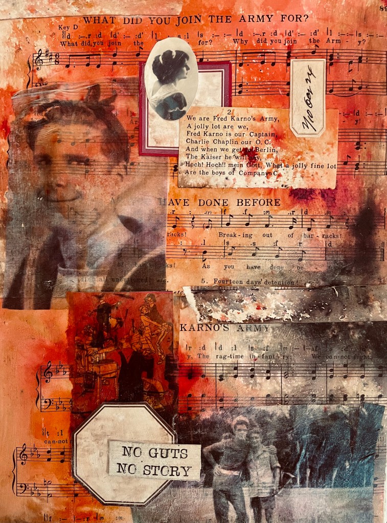 I sprayed the printed tissue paper with varnish so that the prints wouldn’t run when in contact with the glue. I then layered up these images onto the music paper background to create a narrative. I added some other elements I had in my stash to complete the image. I included the phrase “No guts no story” to add further narrative to the collage. Although this collage isn’t strictly about music, I used musical elements to create my collage.