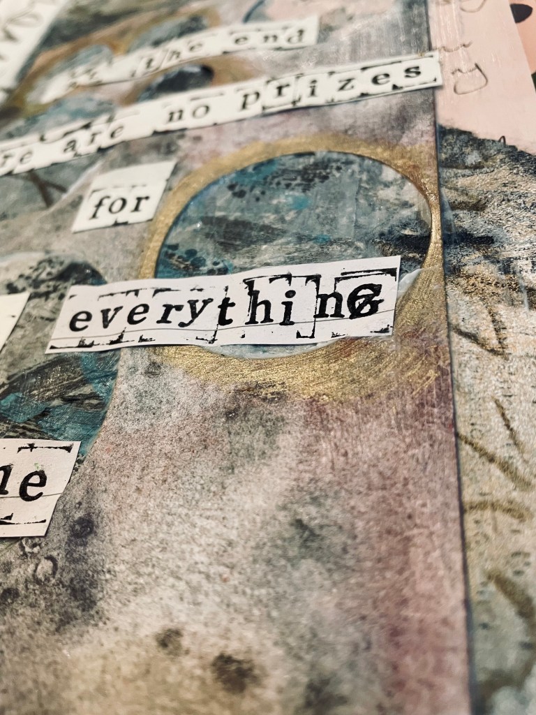 I used some more of the script gel plate prints I had made in this collage. I also included an old to do list of mine, featuring my own handwriting. I used alphabet stamps to create my quote on some scraps of paper. I layered up all these textures to create my collage.