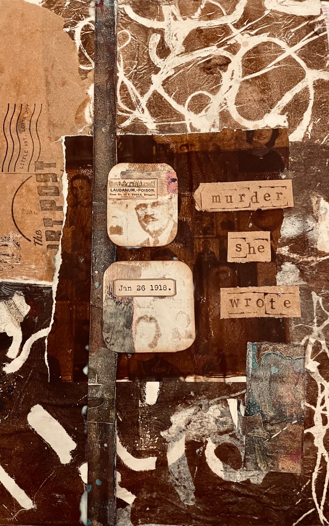 I chose brown for my collage. I went through my stash of papers and collected together all the brown pieces. I like how the brown adds a grungy, vintage aesthetic. As I have enjoyed adding narrative this week I decided to add a murder mystery story to my collage. I used some of the miniature collages I made a few weeks back as focal points. I then added the stamped words “murder she wrote” in brown ink on brown paper. The paper was from an old paper bag.