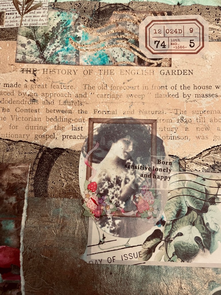 I decided to use some of the gel prints I’d created in earlier lessons. I wanted to create a story like in day 43. I used vintage photographs, book text, handwriting and images to create a narrative. It was a extension of the story I crafted in day 43. It centers around a character who ventures out to different gardens around the world.