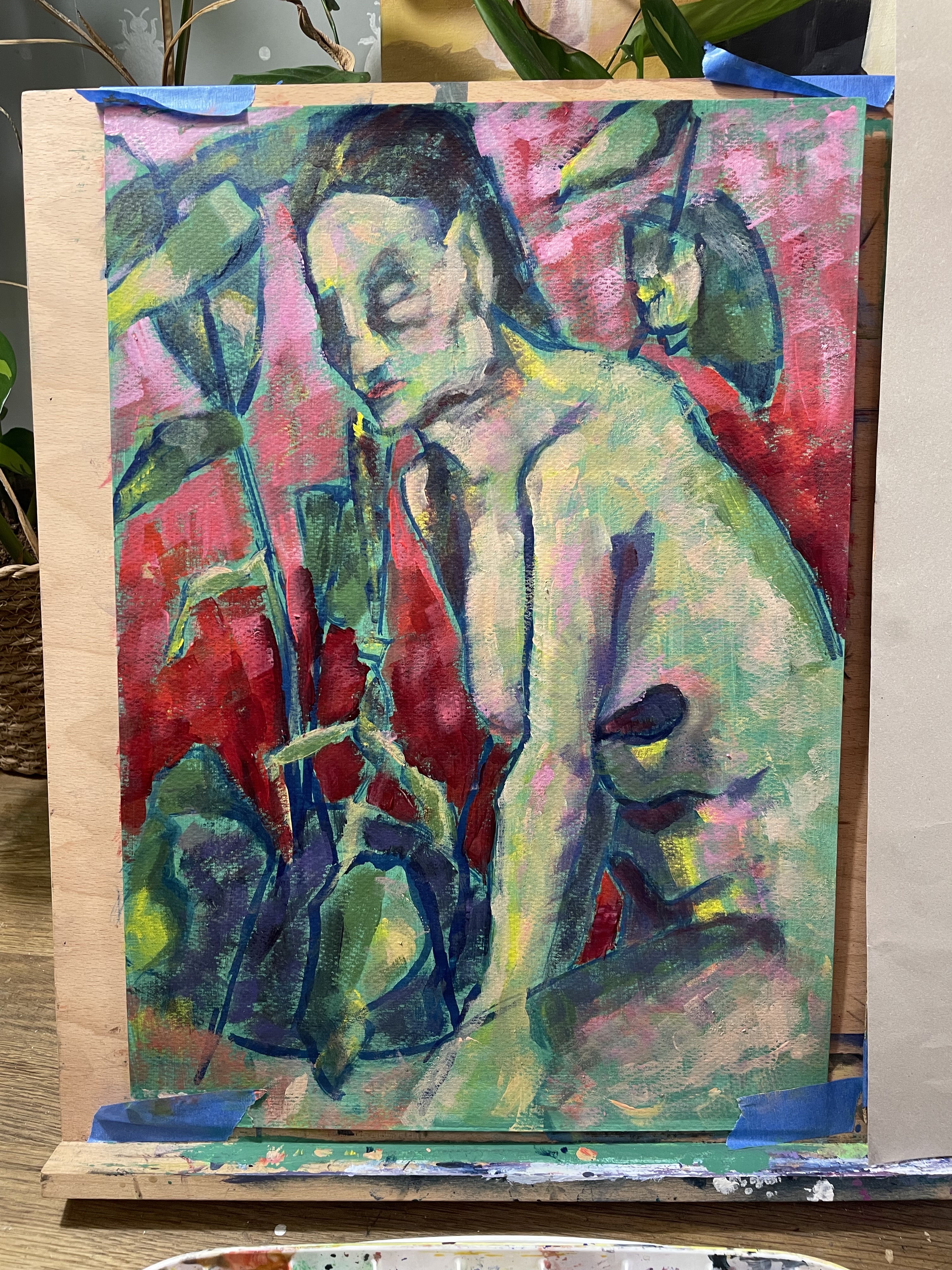 To enhance the impact, I incorporated strong outlines reminiscent of Gauguin and Van Gogh, a technique known as cloisonnism. This approach, characterized by bold colors and dark outlines, gives the painting a striking and stylized look. Additionally, I unified the painting by using the same colors in the model’s flesh and the surrounding plants, creating harmony through repetition.
