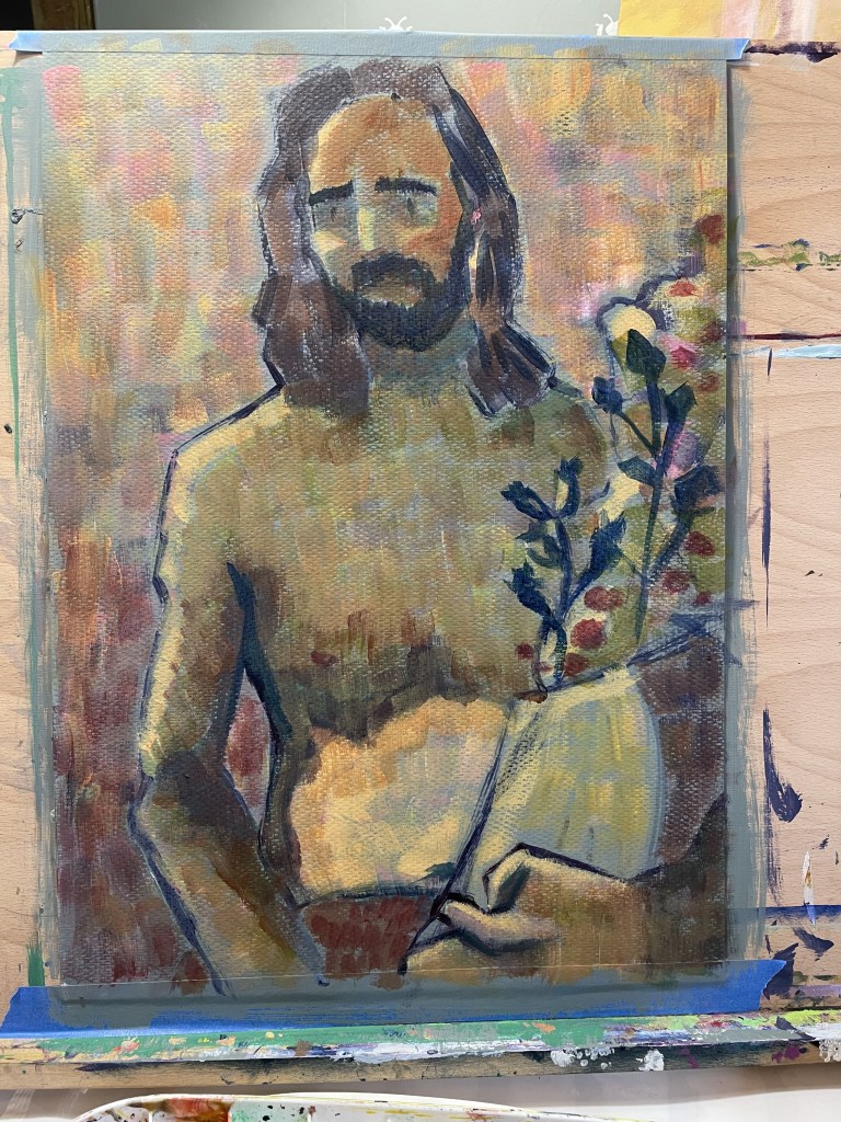 The final painting in this series, “Scott Holding Flowers,” also originated from a life drawing session. I started with a grey ground and followed the same process as the previous two works—building forms with layers of color, using cloisonnism, and incorporating expressive brushwork. This time, however, I refined the outlines, making them finer and more delicate while focusing on subtle details in the face.