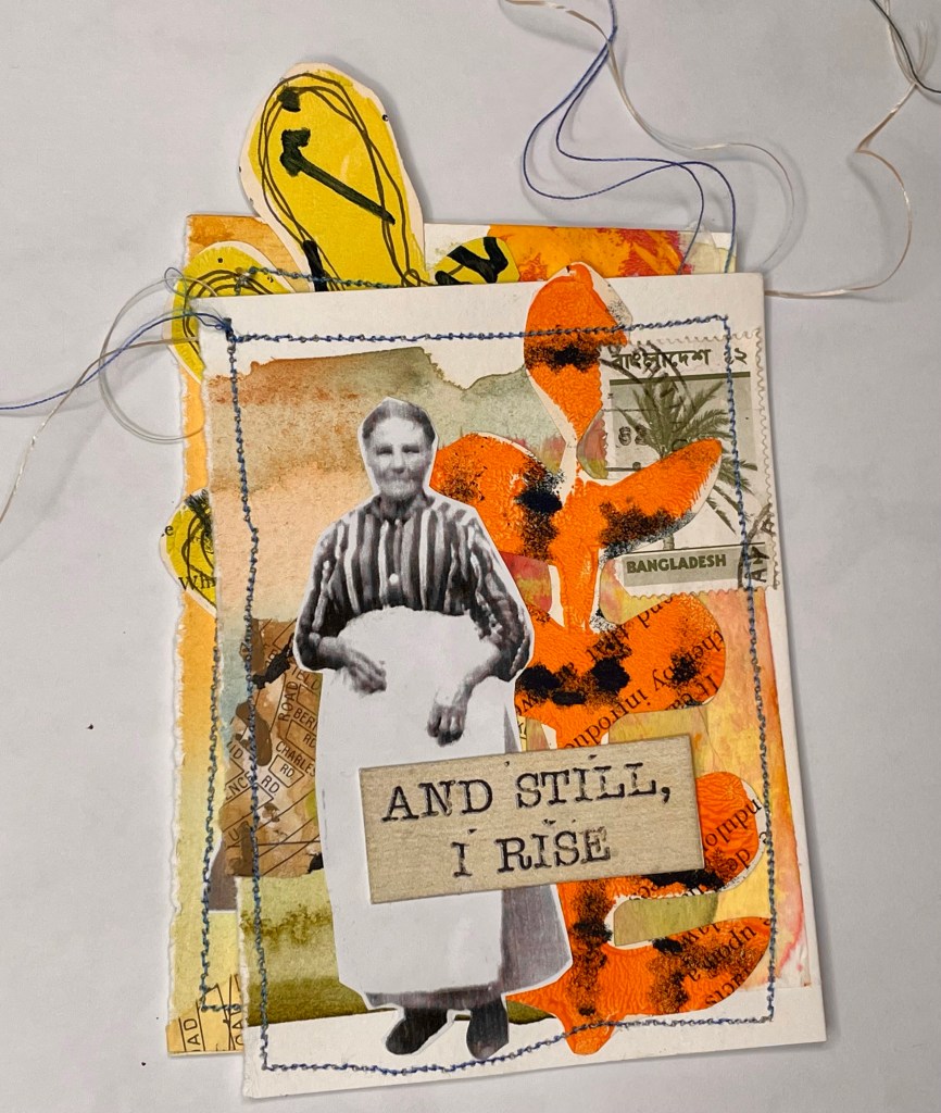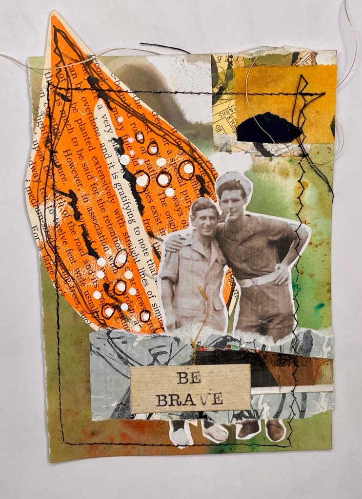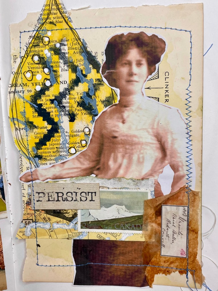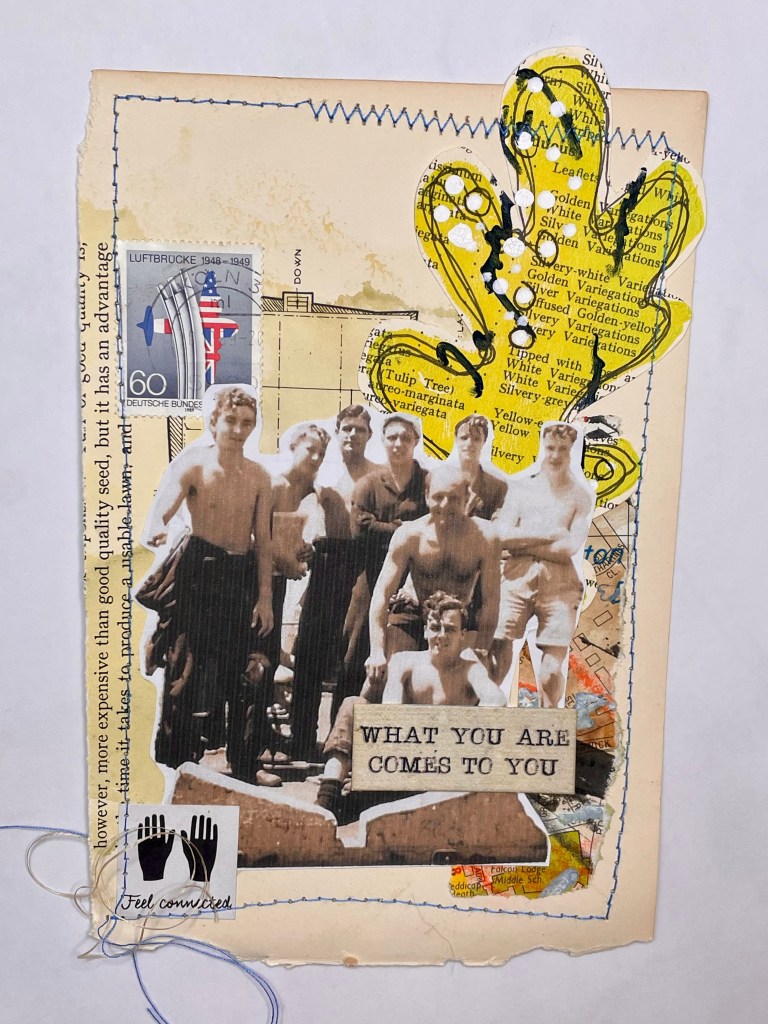 So, what is an assemblage? In art terms, it’s a three-dimensional composition created by combining various materials and objects. In our case, that meant pulling together personal photographs, vintage-style postage stamps, and our own hand-crafted collage fodder into layered, story-rich creations.