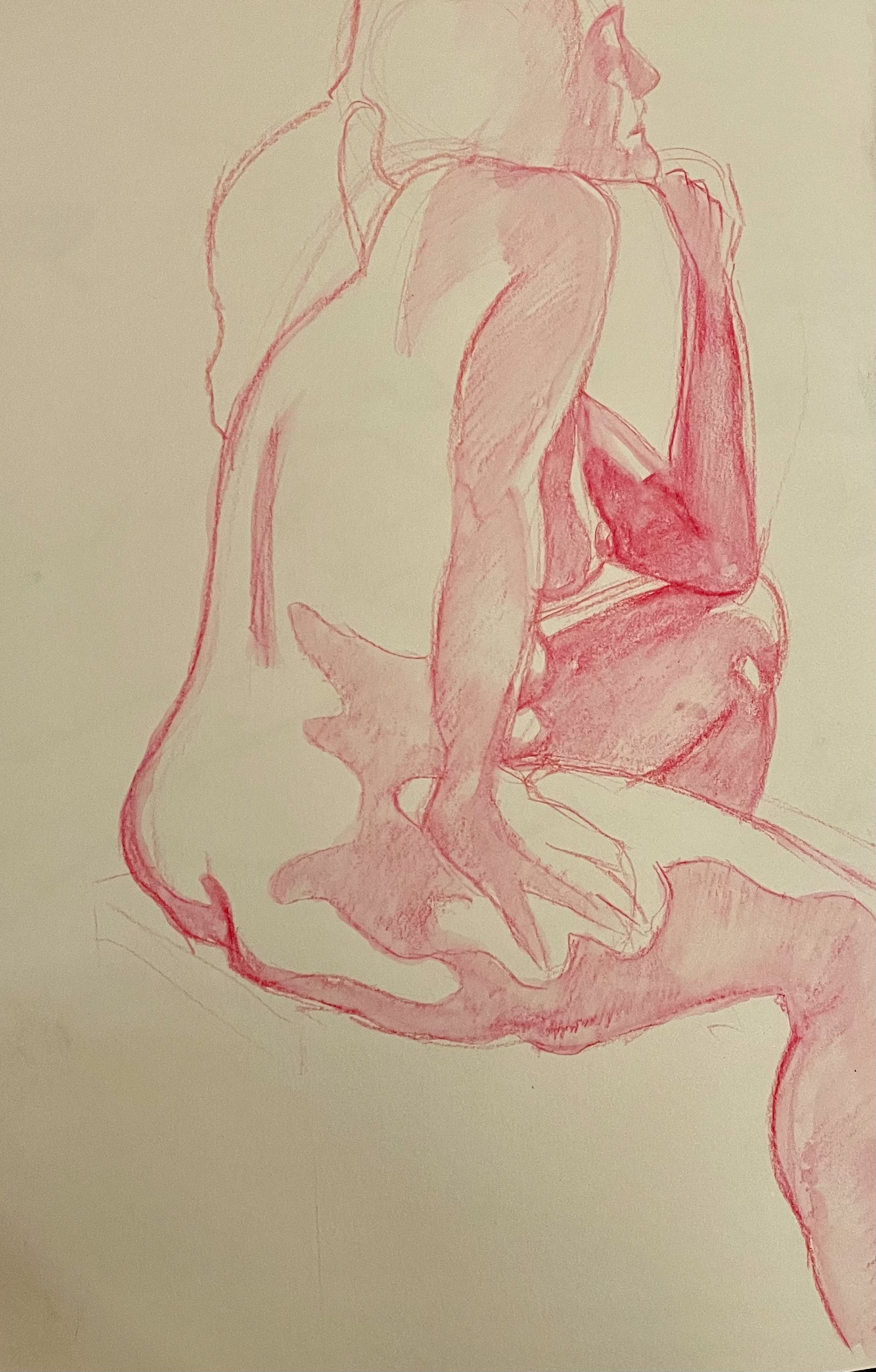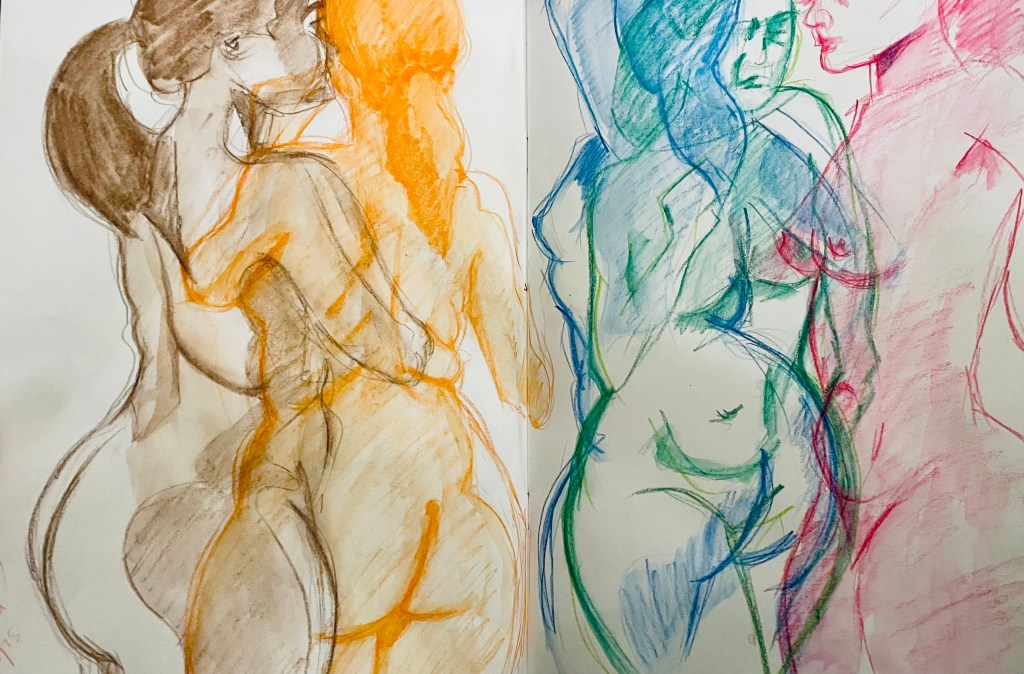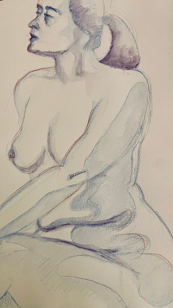 During a recent life drawing session I took the opportunity to explore colour in the form of water colour pencils. I played with layering drawings on top of each other in different colours, drawing in one colour tone and using a limited palette of just two colours. I enjoyed this process of experimentation moving away from drawing in graphite pencil alone and also using a much smaller surface to draw on as I used an A4 sketchbook as opposed to my usual A2 sized drawing paper which was a fun challenge for me.