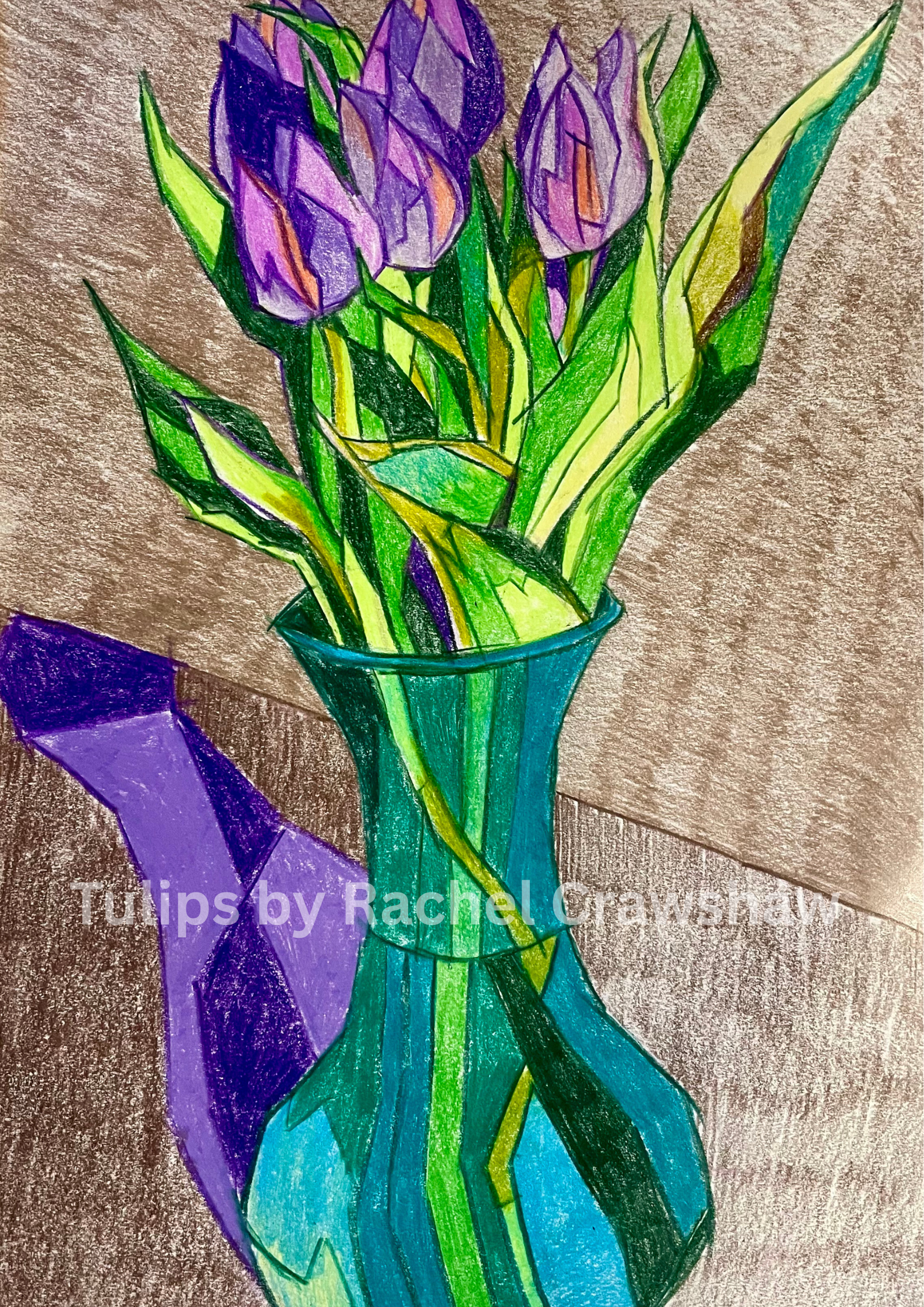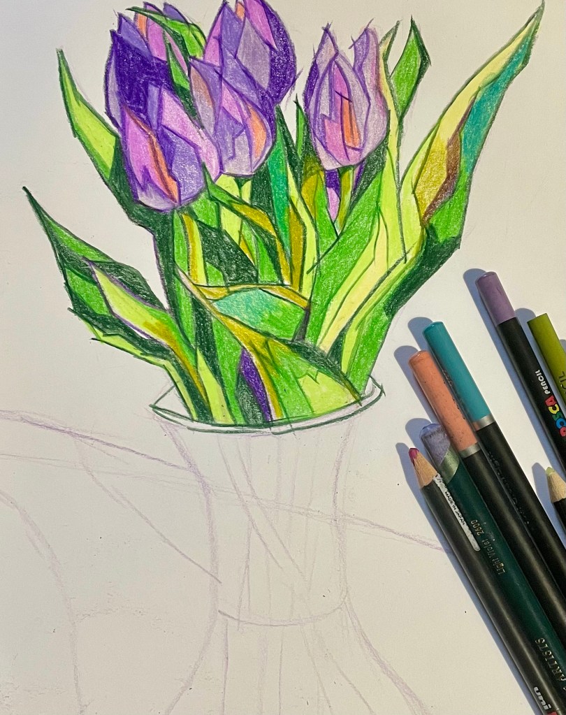 As I sat there I had an intense impulse to draw the flowers. Instead of pushing it away I received this flash of inspiration and went and grabbed my coloured pencils.