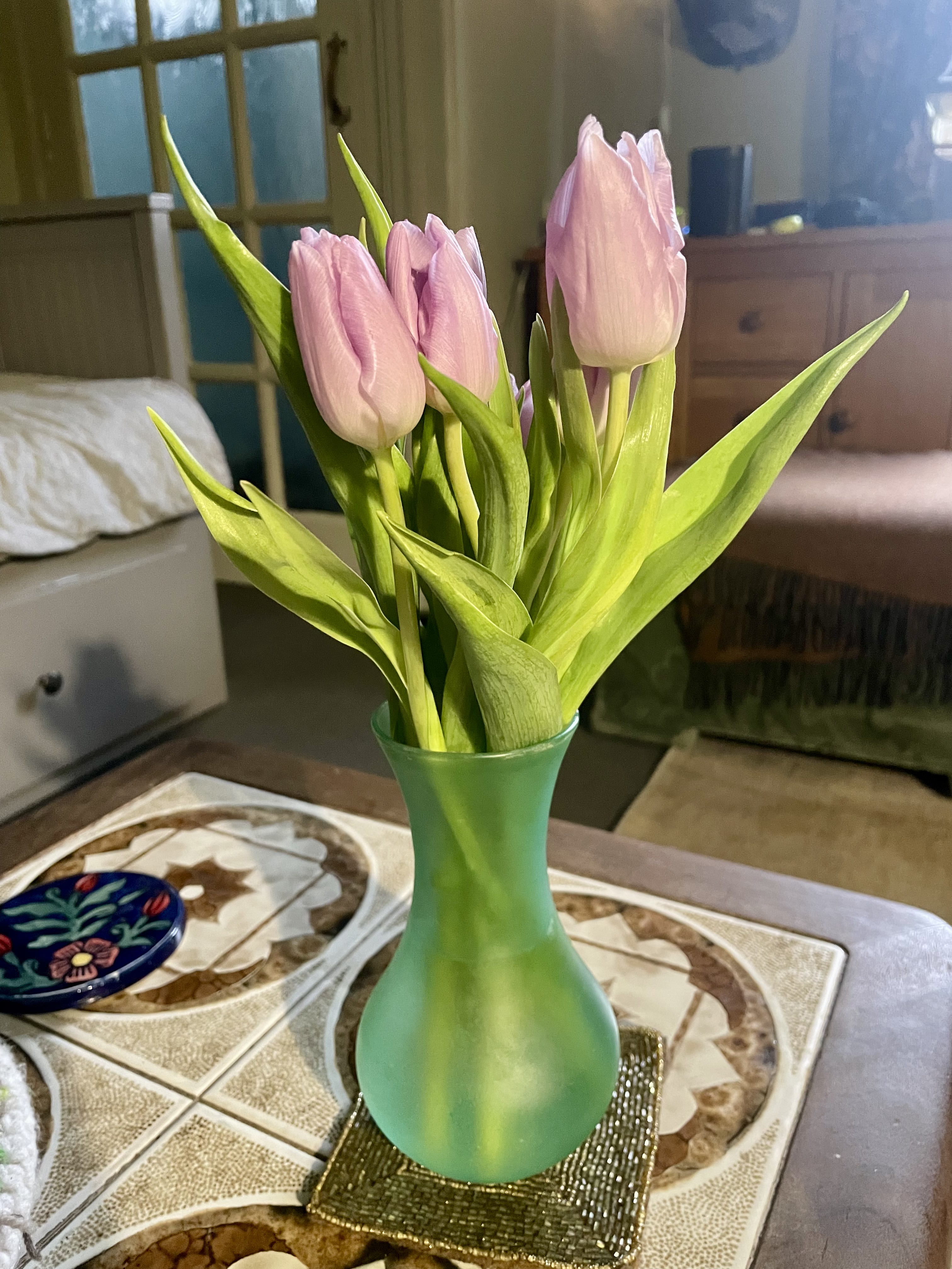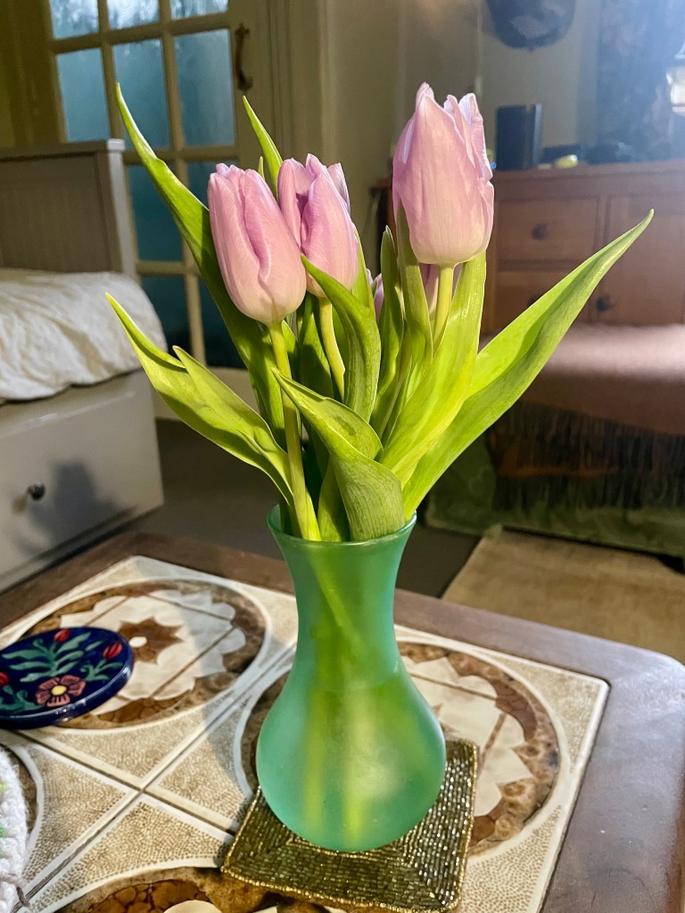 This week I have found myself drawn to the colour purple, so I chose these lovely lilac tulips. I placed them in this turquoise vase and put them on my coffee table. I sat with a cup of coffee and relished the little pocket of joy I’d created for myself.