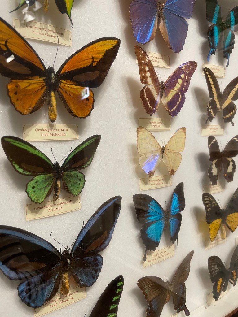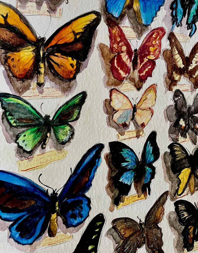 This February my family and I took a special trip to Florence, Italy to celebrate my husband and I’s milestone birthday. One of the places I enjoyed visiting most during the holiday was the Museum of Natural History, La Specola. This painting is from a photograph I took of one of the museum collections of butterflies. The museum was full of room after room of animals, insects, fish and plants as well as geological treasures and fantastic wax anatomical sculptures that were used to help study the human body as well as those of many other species.
