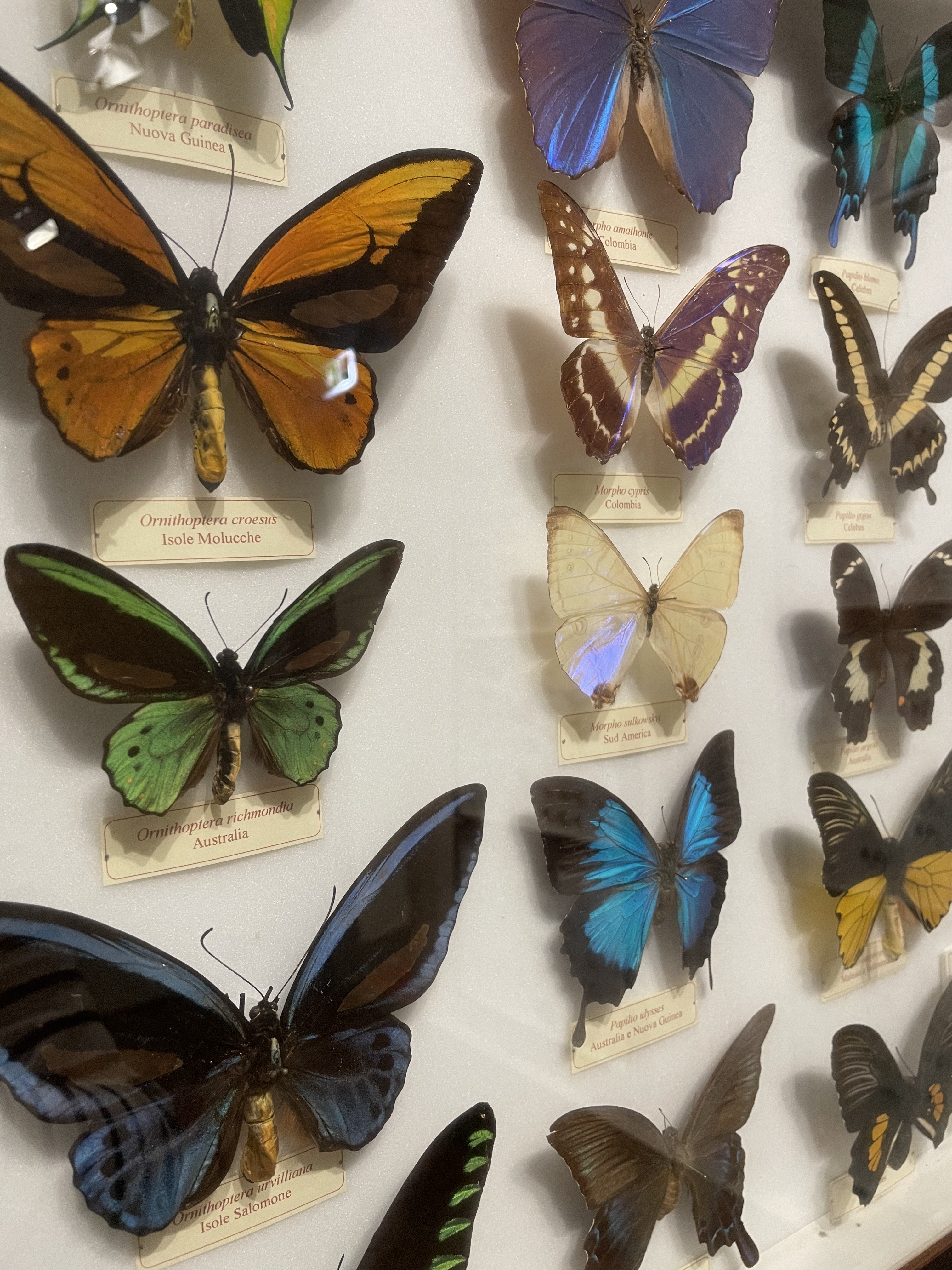 This February my family and I took a special trip to Florence, Italy to celebrate my husband and I’s milestone birthday. One of the places I enjoyed visiting most during the holiday was the Museum of Natural History, La Specola. This painting is from a photograph I took of one of the museum collections of butterflies. The museum was full of room after room of animals, insects, fish and plants as well as geological treasures and fantastic wax anatomical sculptures that were used to help study the human body as well as those of many other species.