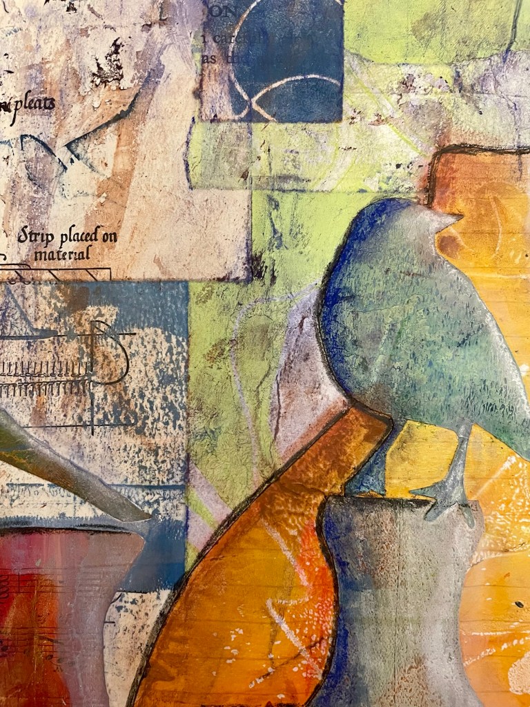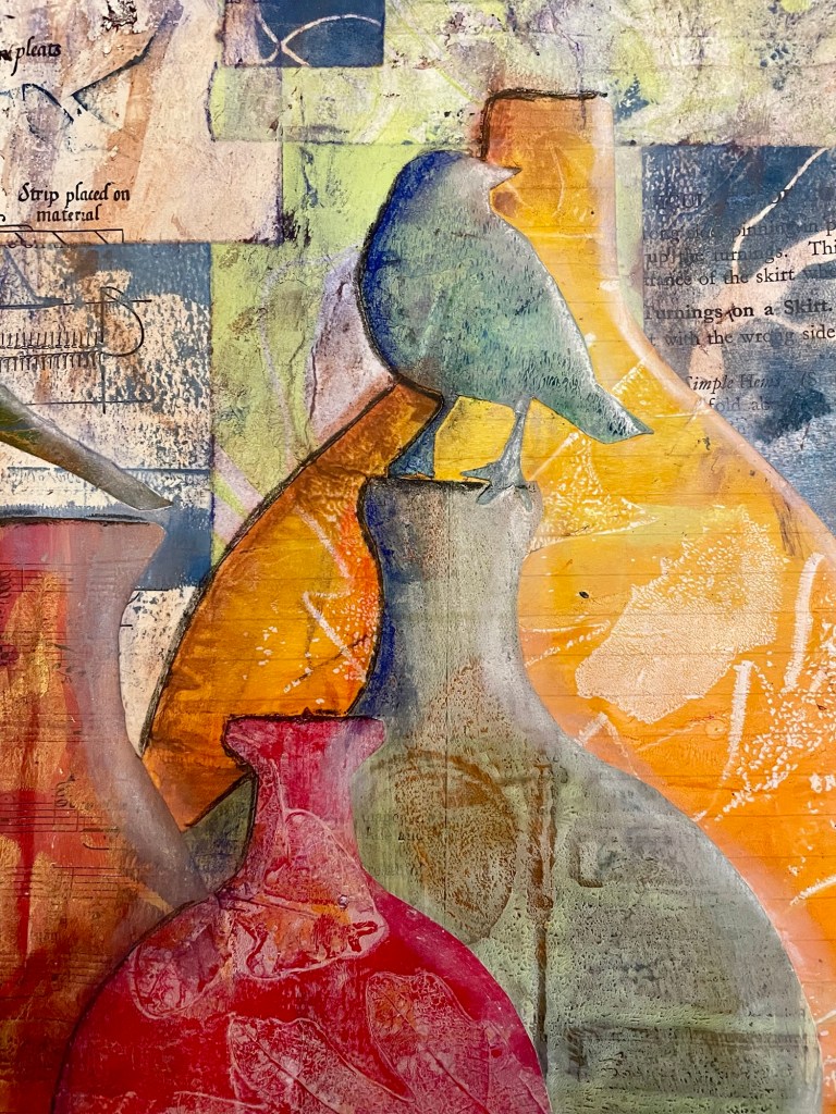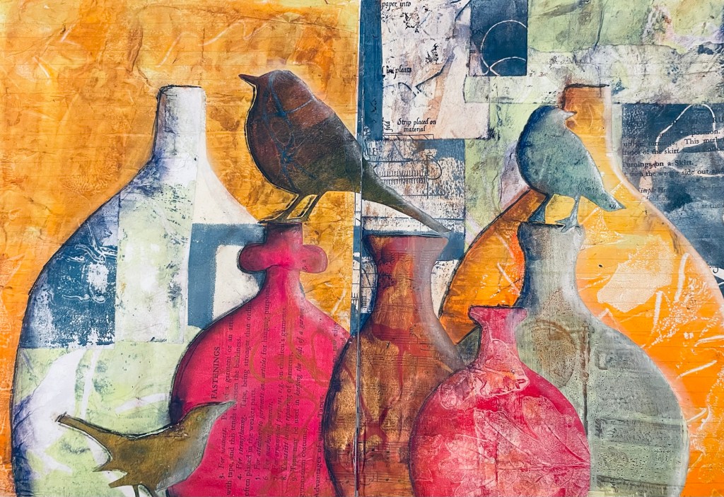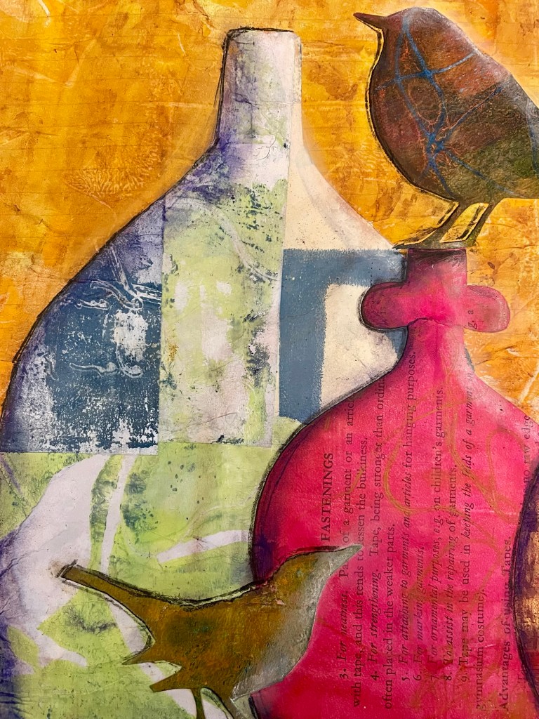 After the printing process came the collage process where I built up the image using my printed papers cut into the shapes of bottles and birds, and layered them on top of each other. I tried to get a good contrast of warm and cool colours.