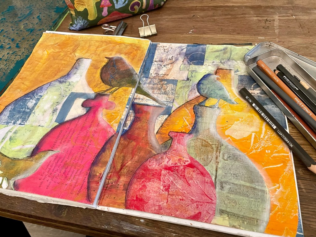 I enjoyed experimenting with different mediums in this sketchbook spread. The title “Messengers in a bottle” references the symbol of birds being messengers from the unconscious mind.