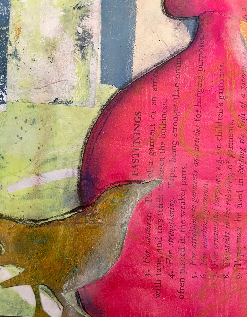 The gel prints are made using acrylic paints and I printed on a range of papers including lined exercise book pages, vintage book pages, vintage music paper and other scrap papers. The vintage book I used was a sewing manual. I enjoy the way the sewing book text and diagrams show through the prints.