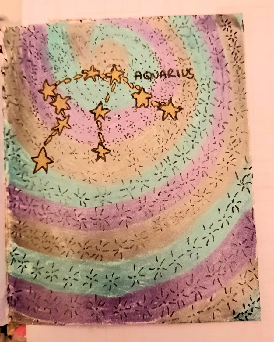 In today's journal entry I used some good old fashioned pencil crayons, these ones are metallic although its hard to tell from the photograph. I chose "Aquarius" as a theme because today is my brother's birthday and he is an Aquarian!