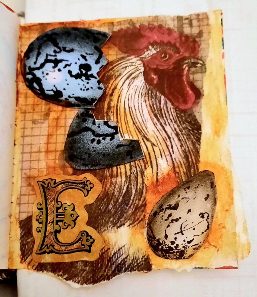 In today's entry I went for an anthropomorphic bird theme! I used found images of birds dressed up as humans for the background and added a vellum pocket in which I stuck this delightfully creepy bird man. He looks a bit like he is wearing a plague mask. I then added and distressed the hand …