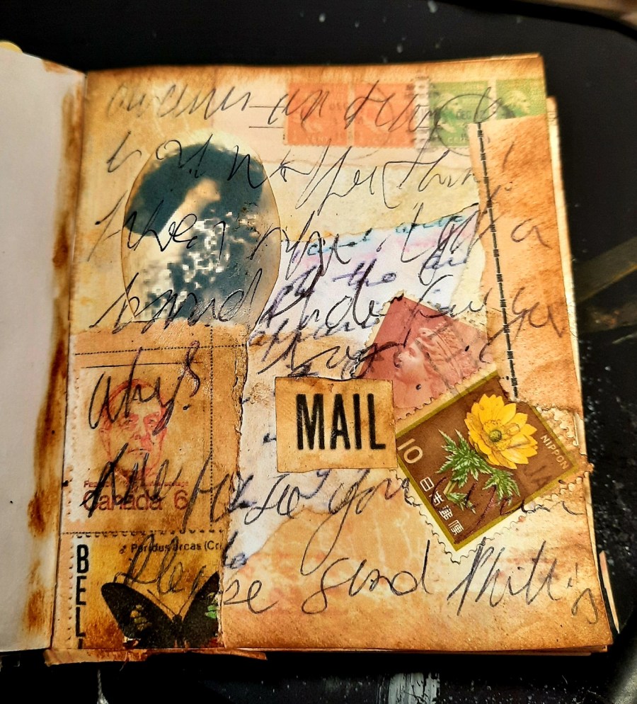 In today's miniature art journal page I used vintage stamps and photocopies from stamp collecting albums, vintage style letters, aged photographs and ink to create this vintage "post" inspired spread. I then scrawled all over the page with a ball point pen in my illegible handwriting!